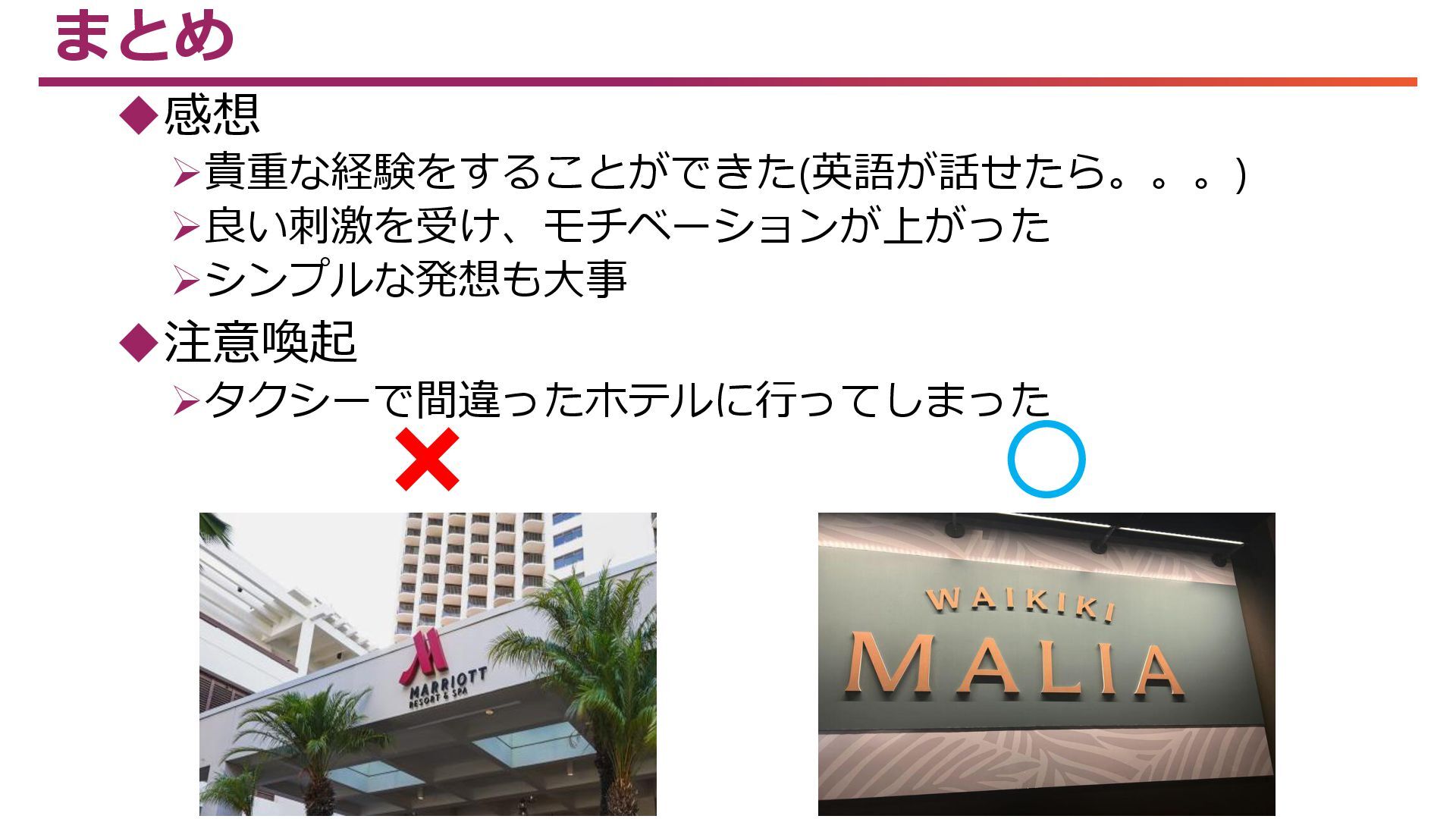 まとめ ◆感想 ➢貴重な経験をすることができた(英語が話せたら。。。) ➢良い刺激を受け、モチベーションが上がった ➢シンプルな発想も大事 ◆注意喚起 ➢タクシーで間違ったホテルに行ってしまった