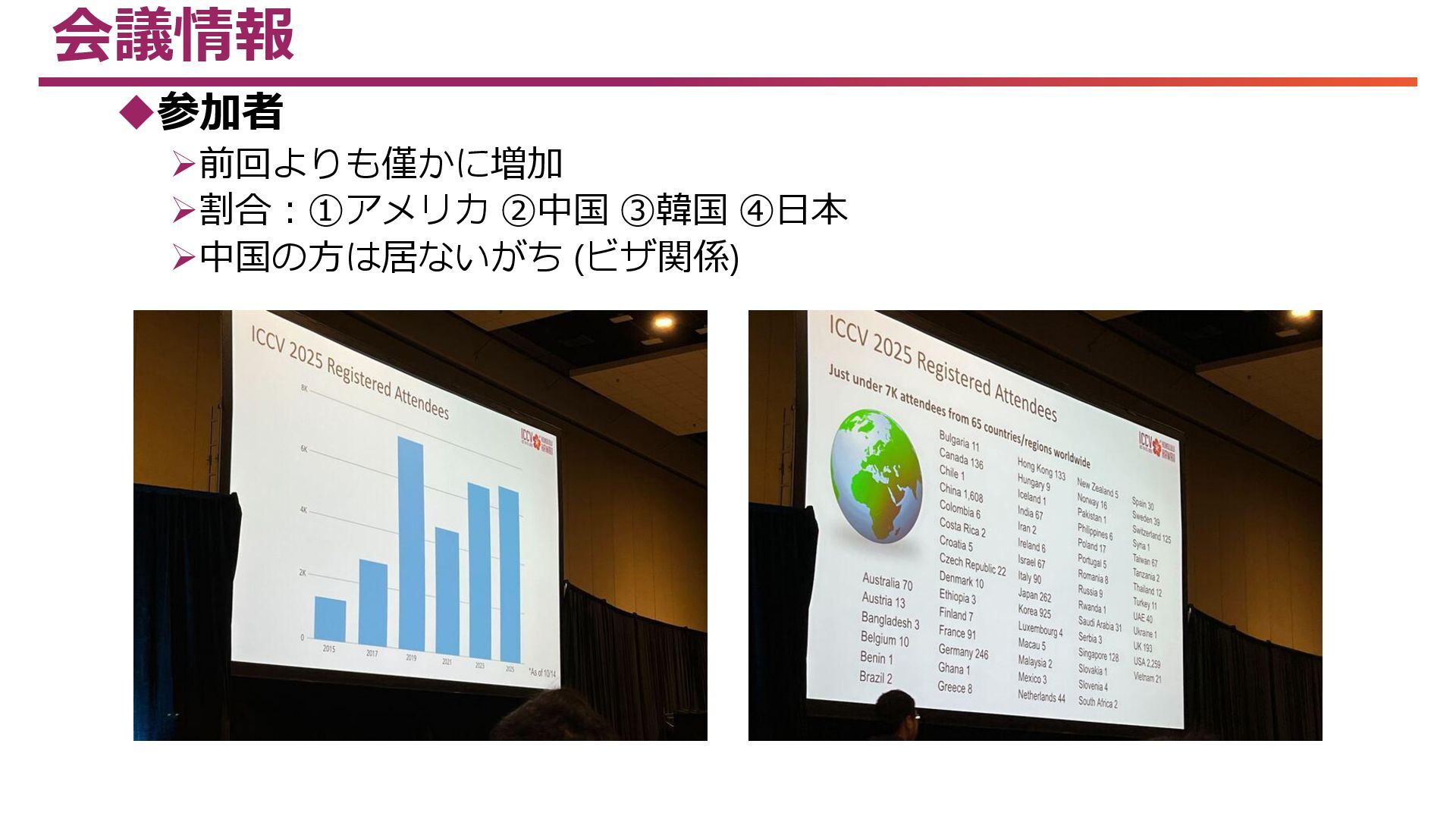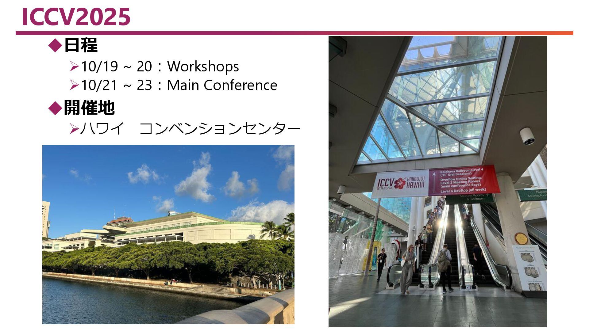 ICCV2025 ◆日程 ➢10/19 ~ 20:Workshops ➢10/21 ~ 23:Main Conference ◆開催地
