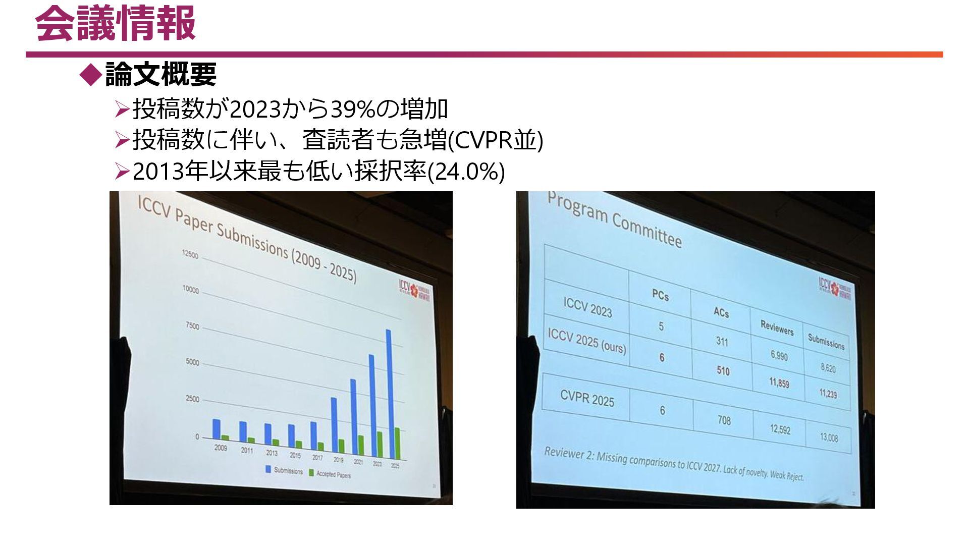 会議情報 ◆論文概要 ➢投稿数が2023から39%の増加 ➢投稿数に伴い、査読者も急増(CVPR並) ➢2013年以来最も低い採択率(24.0%)