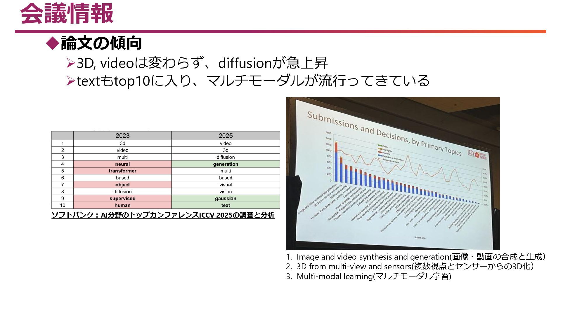 会議情報 ◆論文の傾向 ➢3D, videoは変わらず、diffusionが急上昇 ➢textもtop10に入り、マルチモーダルが流行ってきている ソフトバンク:AI分野のトップカンファレンスICCV 2025の調査と分析 1. Image and