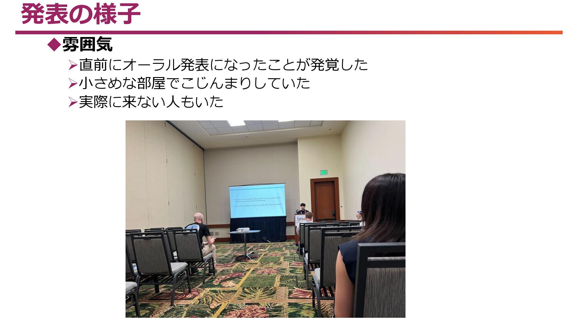 発表の様子 ◆雰囲気 ➢直前にオーラル発表になったことが発覚した ➢小さめな部屋でこじんまりしていた ➢実際に来ない人もいた