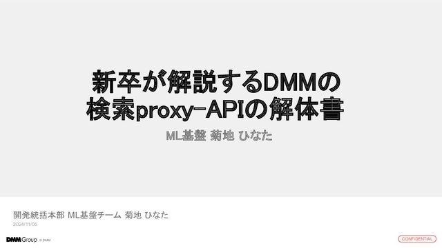 24新卒でDMM.comへ入社し、データ基盤開発部への配属されました。本資料では弊チームの持つ検索proxy APIの開発方法について説明します。 社外向けイベントでの登壇資料です Event: https://dmm.connpass.com/event/335033/