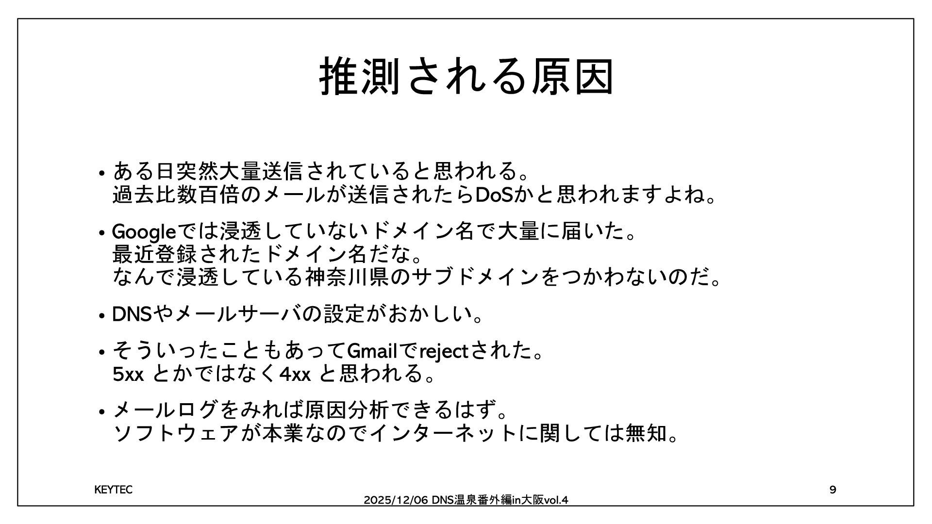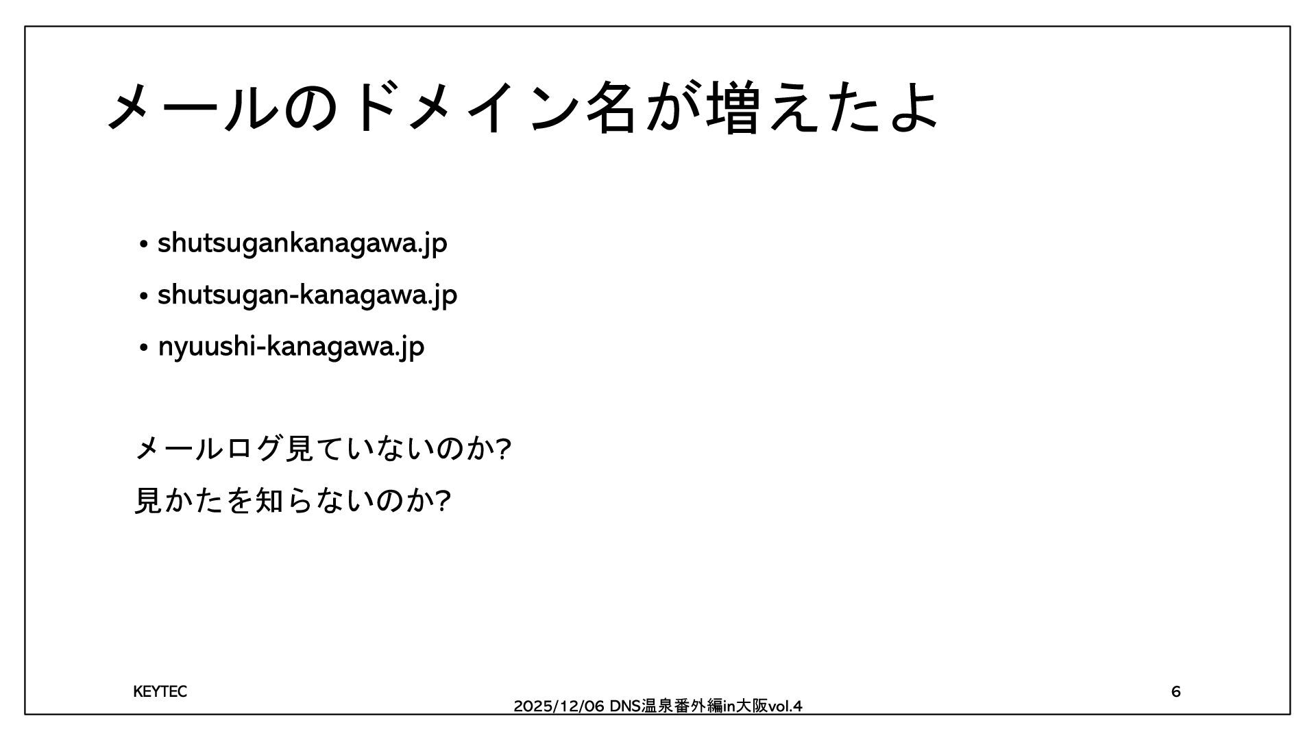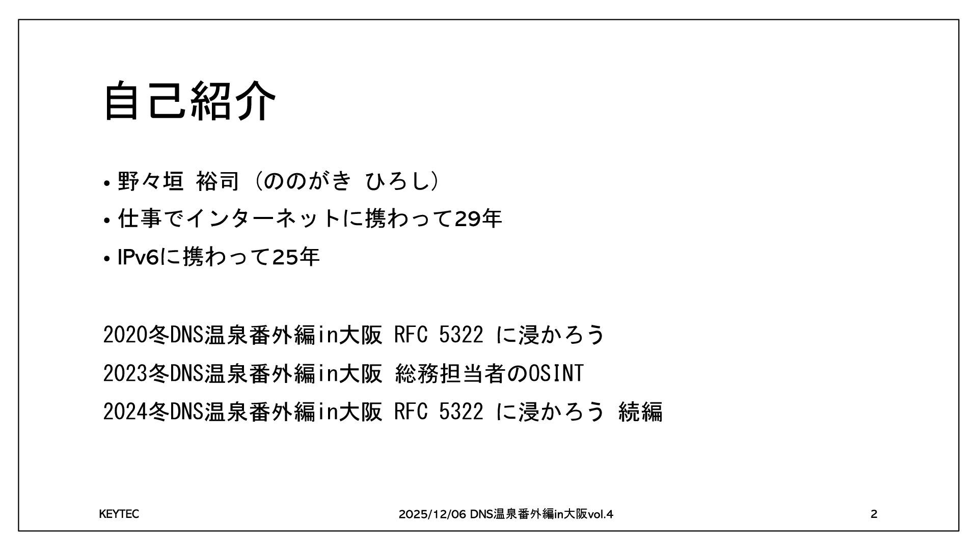 に携わって 年 2020冬DNS温泉番外編in大阪 RFC 5322 に浸かろう 2023冬DNS温泉番外編in大阪 総務担当者のOSINT 2024冬DNS温泉番外編in大阪 RFC 5322 に浸かろう 続編 温泉番外編 大阪