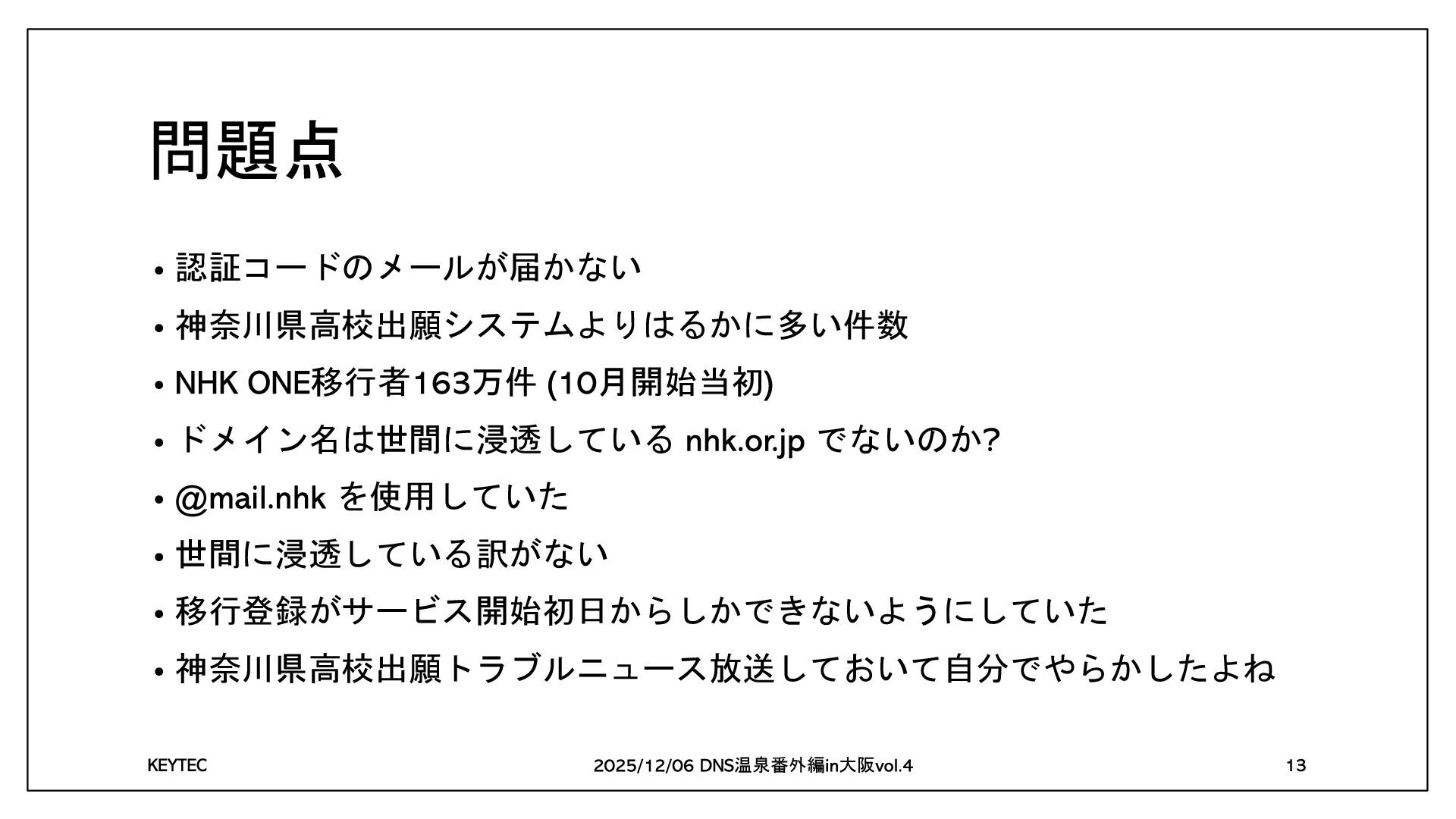 ドメイン名は世間に浸透している でないのか • を使用していた • 世間に浸透している訳がない • 移行登録がサービス開始初日からしかできないようにしていた • 神奈川県高校出願トラブルニュース放送しておいて自分でやらかしたよね 温泉番外編 大阪