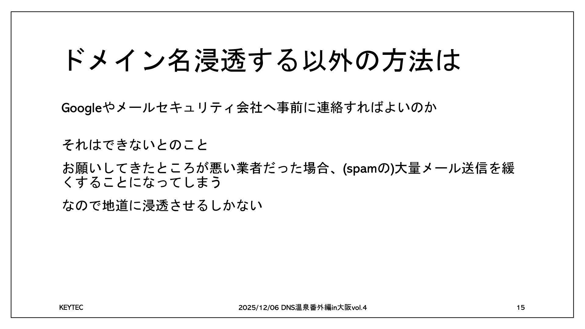 ドメイン名浸透する以外の方法は やメールセキュリティ会社へ事前に連絡すればよいのか それはできないとのこと お願いしてきたところが悪い業者だった場合、 の 大量メール送信を緩 くすることになってしまう なので地道に浸透させるしかない 温泉番外編 大阪