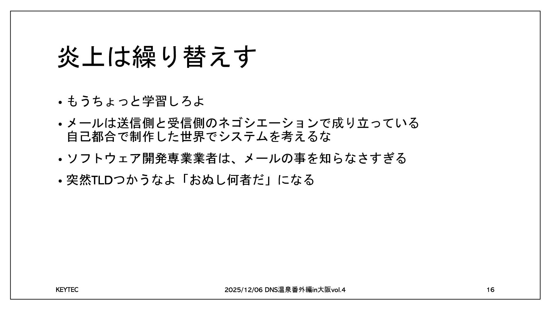 炎上は繰り替えす • もうちょっと学習しろよ • メールは送信側と受信側のネゴシエーションで成り立っている 自己都合で制作した世界でシステムを考えるな • ソフトウェア開発専業業者は、メールの事を知らなさすぎる • 突然