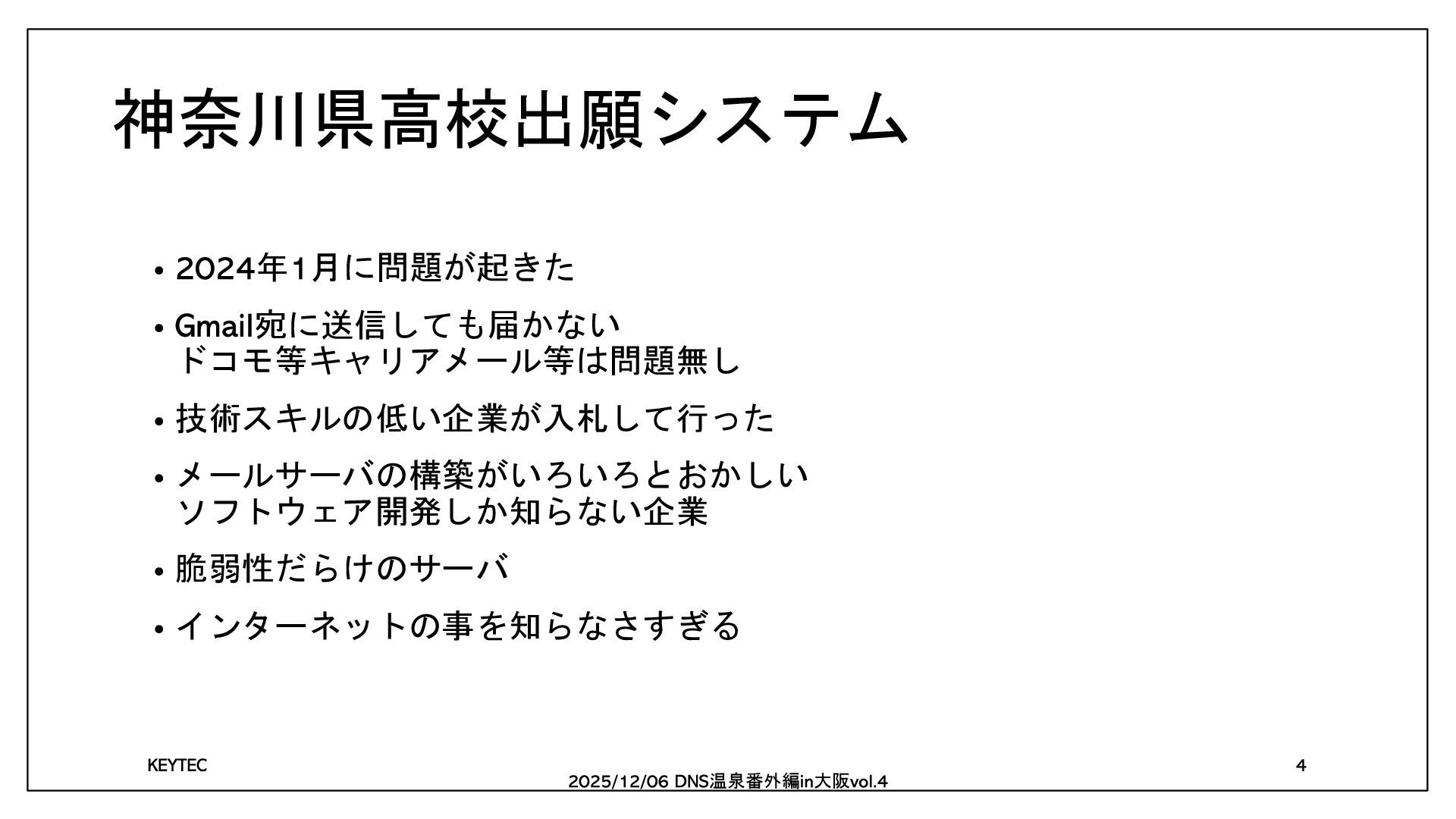 神奈川県高校出願システム • 年 月に問題が起きた • 宛に送信しても届かない ドコモ等キャリアメール等は問題無し • 技術スキルの低い企業が入札して行った •