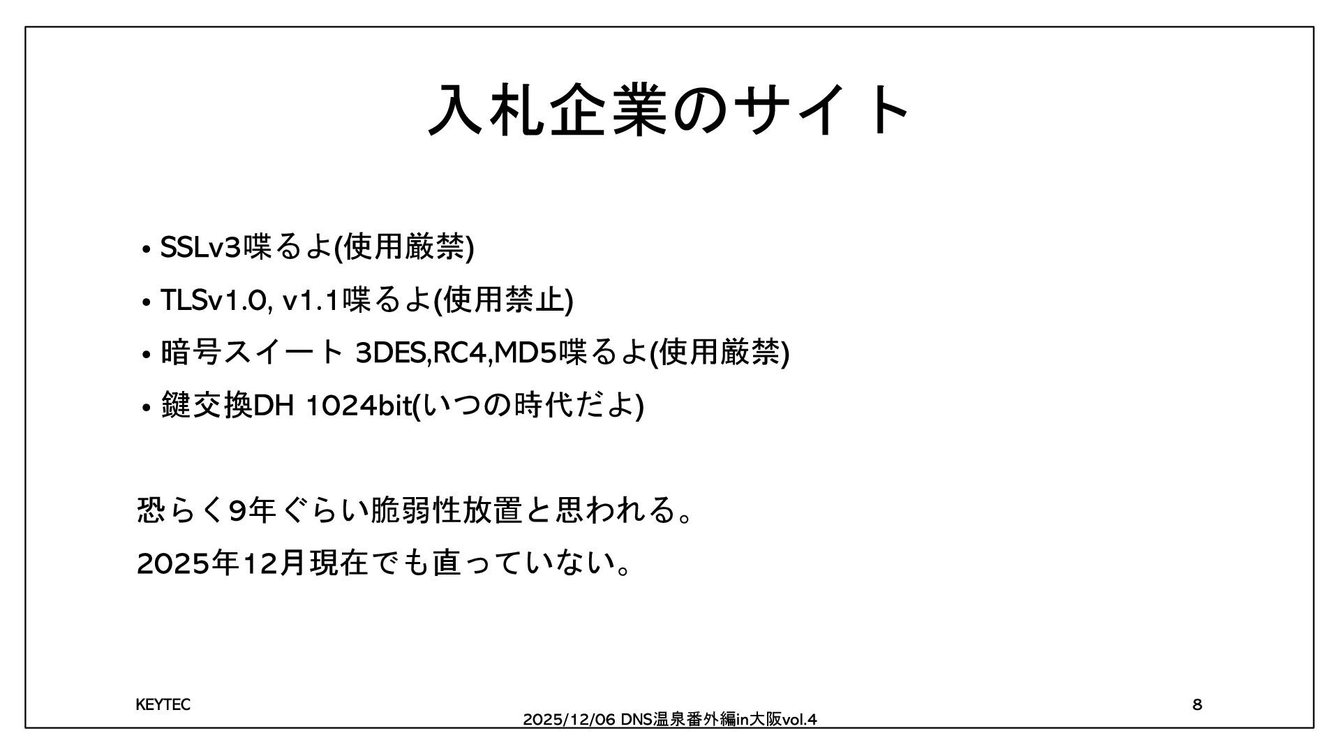暗号スイート 喋るよ 使用厳禁 • 鍵交換 いつの時代だよ 恐らく 年ぐらい脆弱性放置と思われる。 年 月現在でも直っていない。
