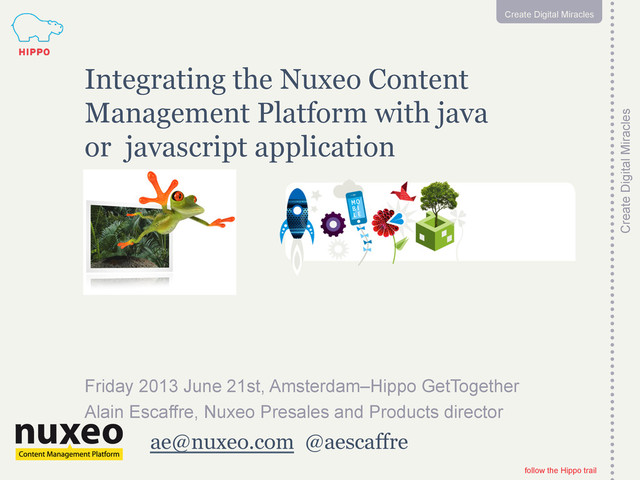 Hippo trail 1 Create Digital Miracles [email protected] @aescaffre Integrating the Nuxeo Content Management Platform with java or javascript application Friday 2013 June 21st, Amsterdam–Hippo GetTogether Alain Escaffre, Nuxeo Presales and Products director