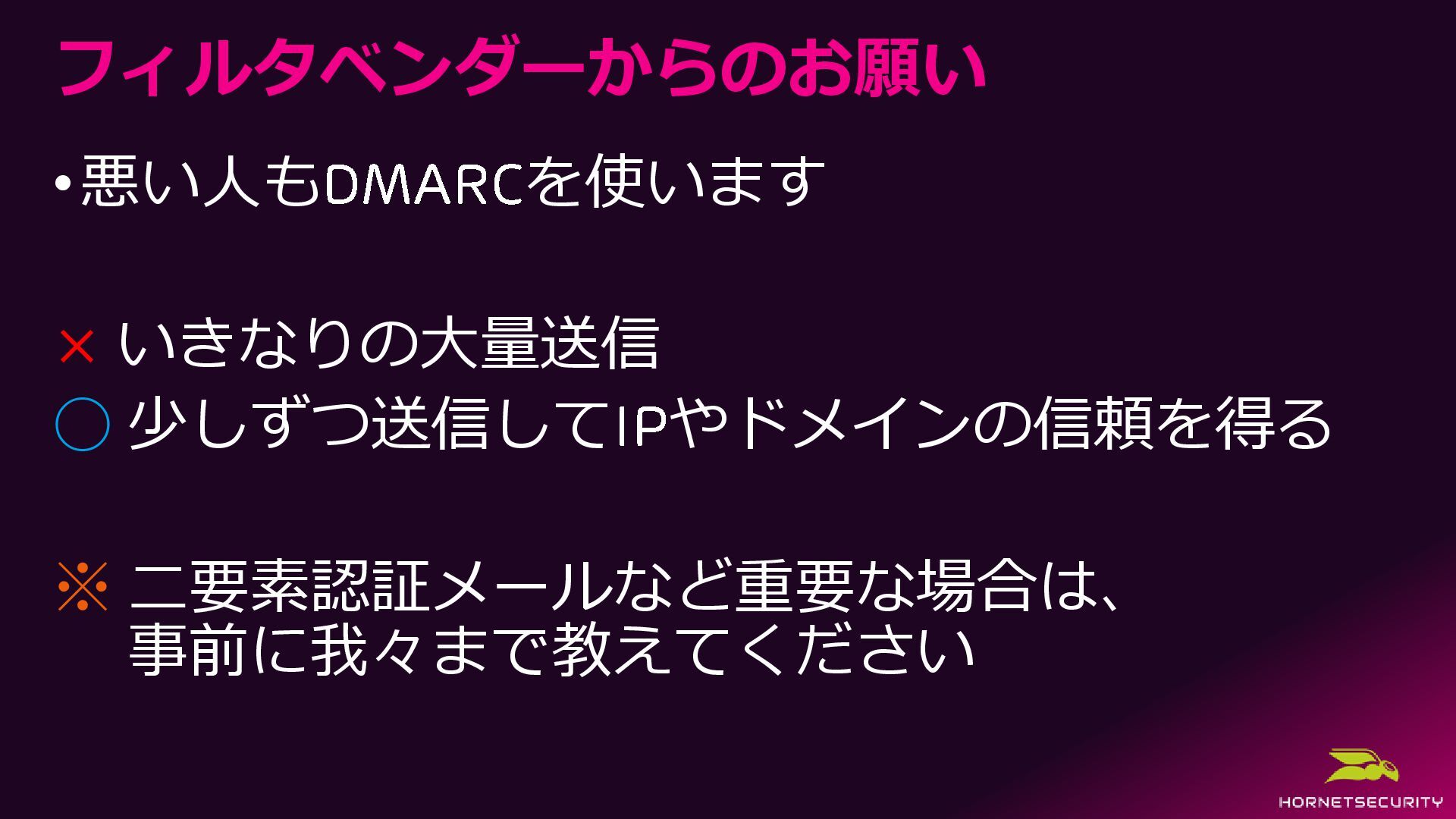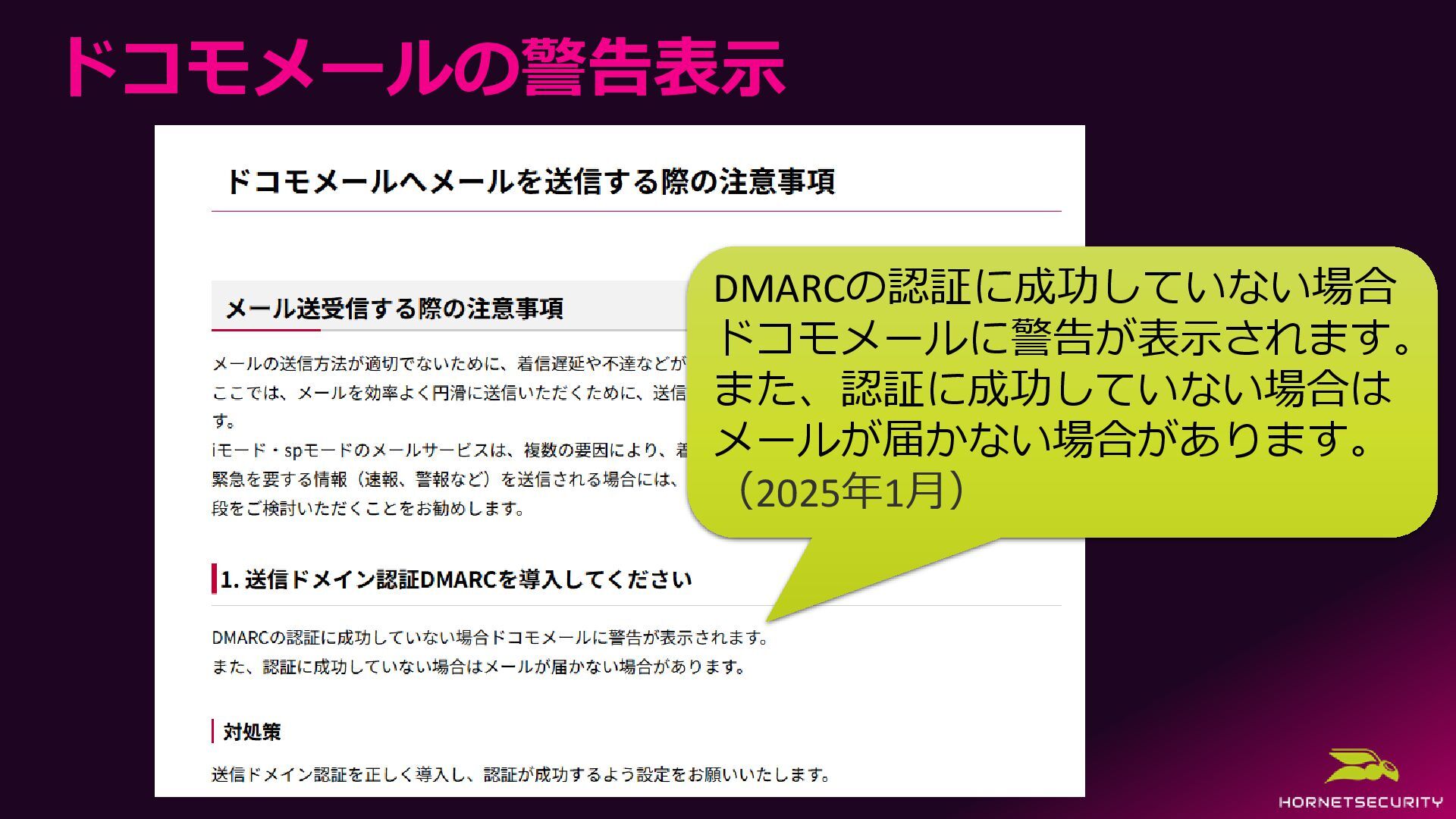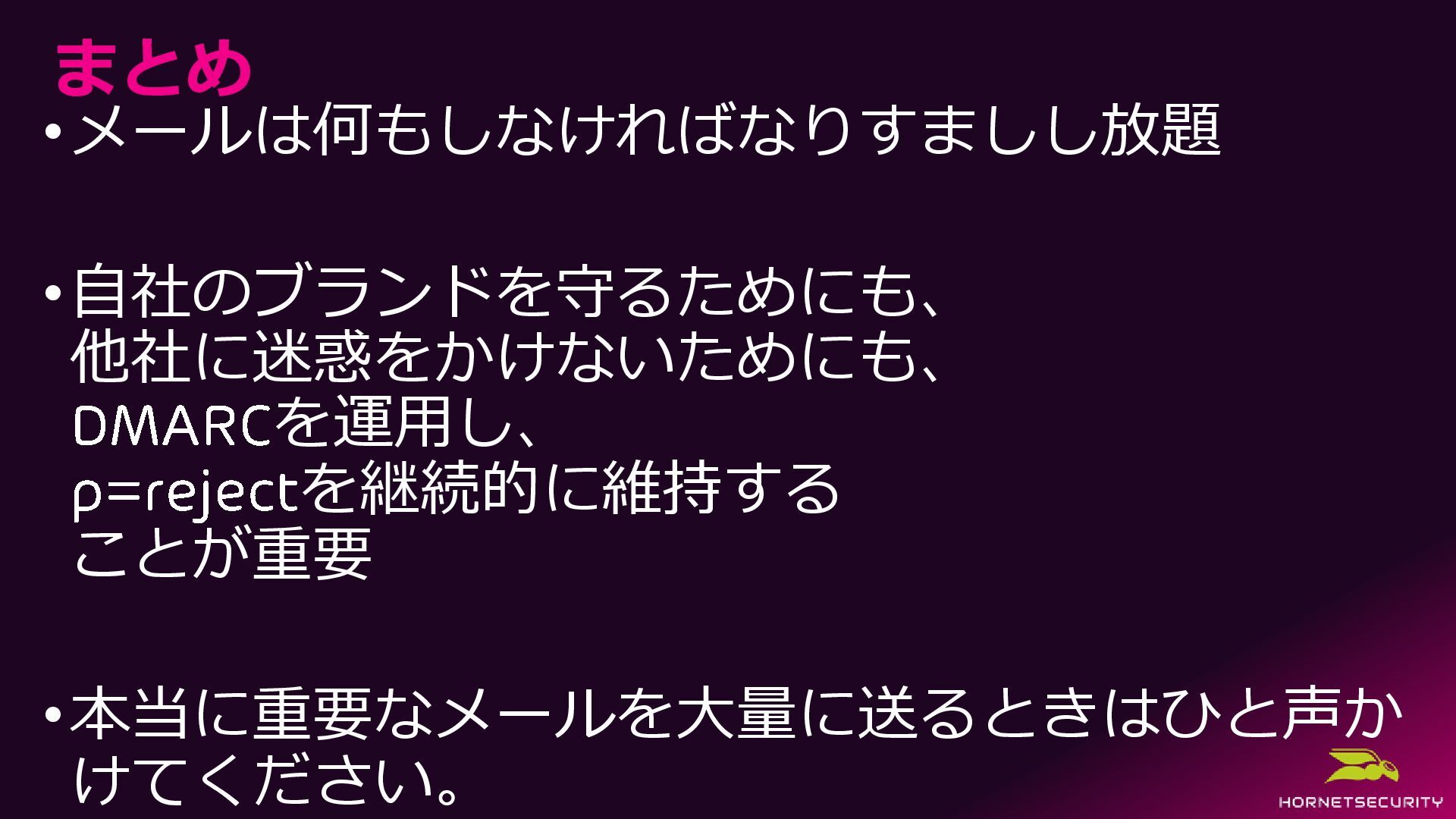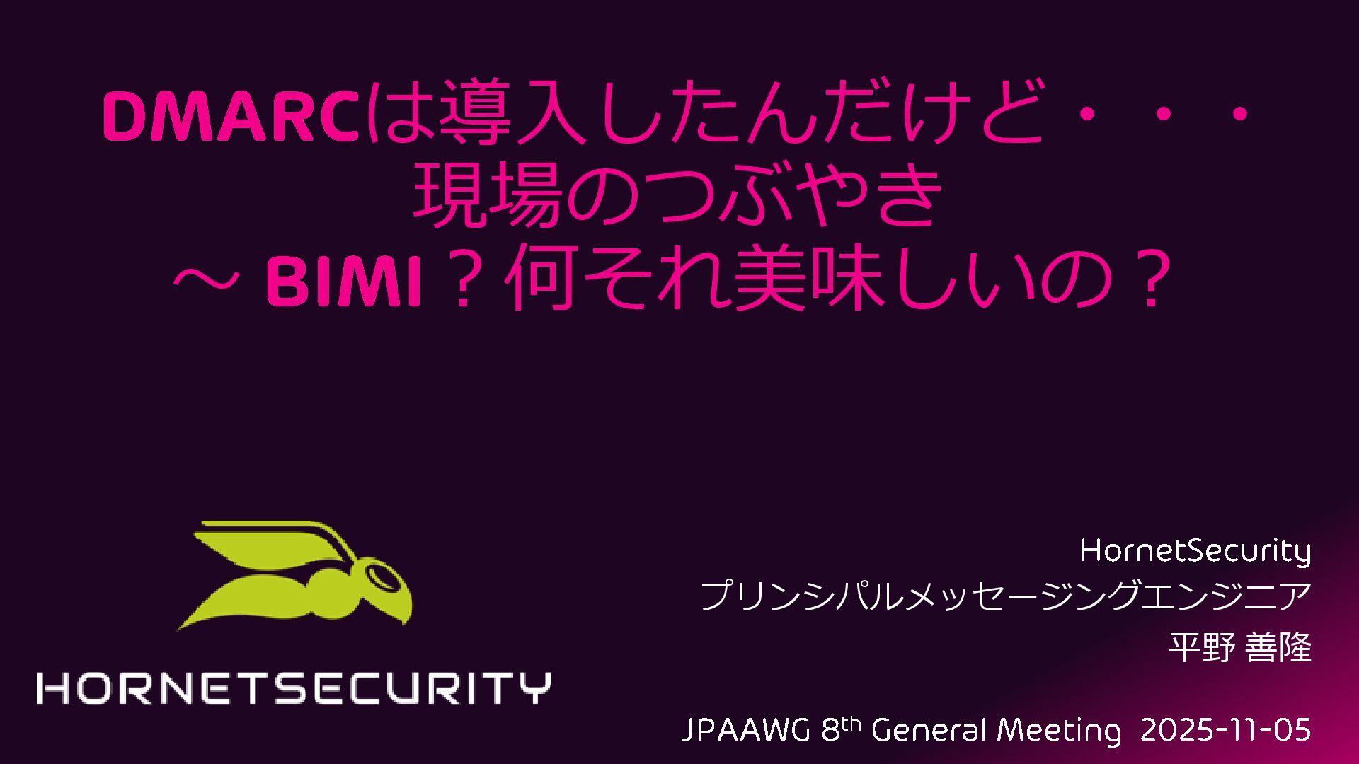 DMARCの導入は多くの企業で進みつつありますが、実際の現場からは「SPFの更新が追いつかない」「DMARCレポートを見ても理解できない」「p=noneから先に進めない」といった声が数多く聞かれます。DMARCは、導入しただけでは十分な効果が得られず、日々の運用こそが真の課題なのです。本セッションでは、こうした“現場のつぶやき”を切り口に、なぜDMARCの運用が難しいのかを整理し、その解決策を探ります。さらに最新のトレンドとも言える「BIMI」にも触れ、今後のメールセキュリティを考える上で押さえておきたいポイントや、運用の壁をどう乗り越えるか、そのヒントを紹介します。
