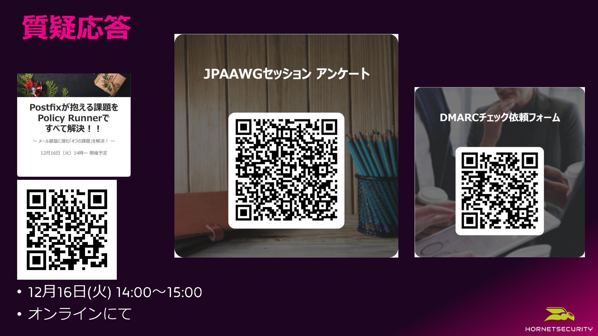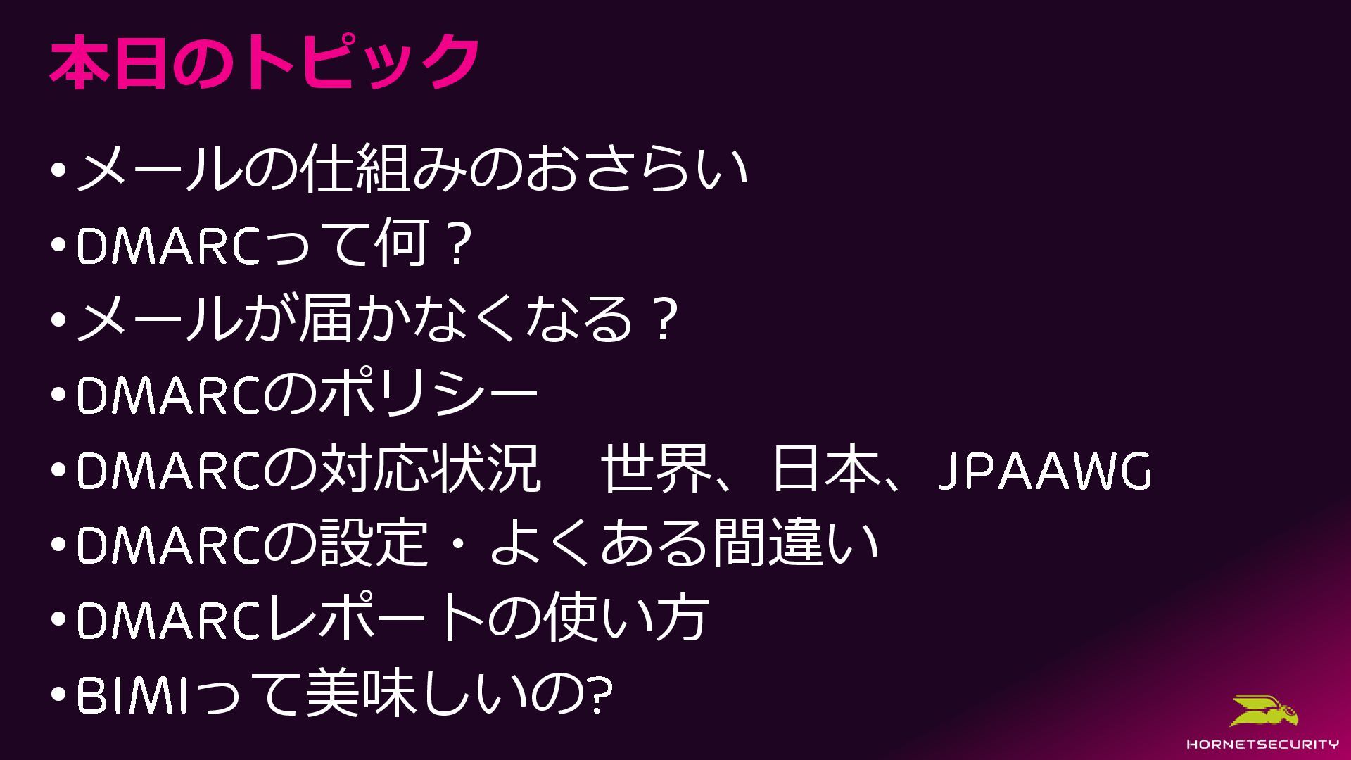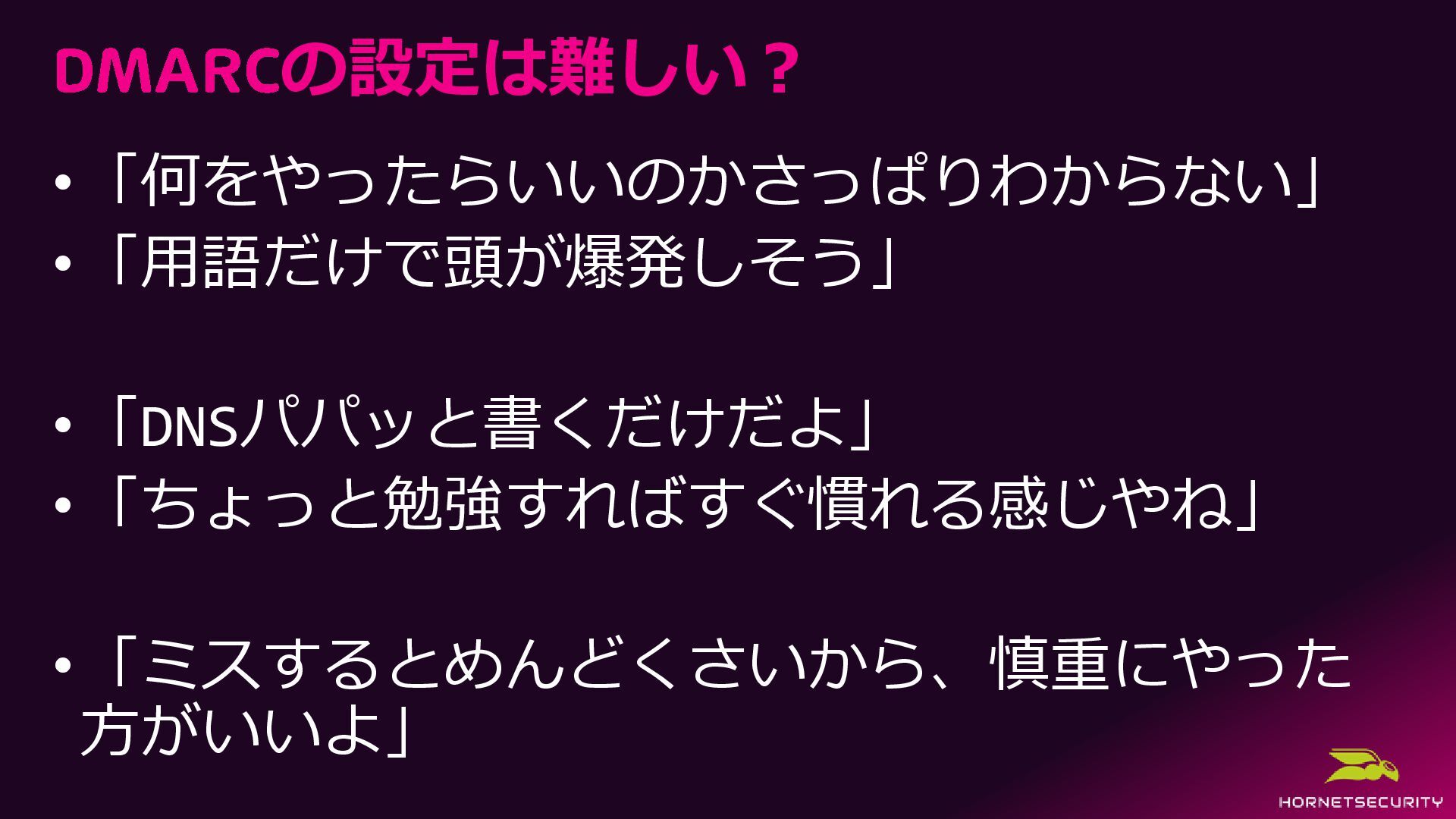 DMARCの導入は多くの企業で進みつつありますが、実際の現場からは「SPFの更新が追いつかない」「DMARCレポートを見ても理解できない」「p=noneから先に進めない」といった声が数多く聞かれます。DMARCは、導入しただけでは十分な効果が得られず、日々の運用こそが真の課題なのです。本セッションでは、こうした“現場のつぶやき”を切り口に、なぜDMARCの運用が難しいのかを整理し、その解決策を探ります。さらに最新のトレンドとも言える「BIMI」にも触れ、今後のメールセキュリティを考える上で押さえておきたいポイントや、運用の壁をどう乗り越えるか、そのヒントを紹介します。