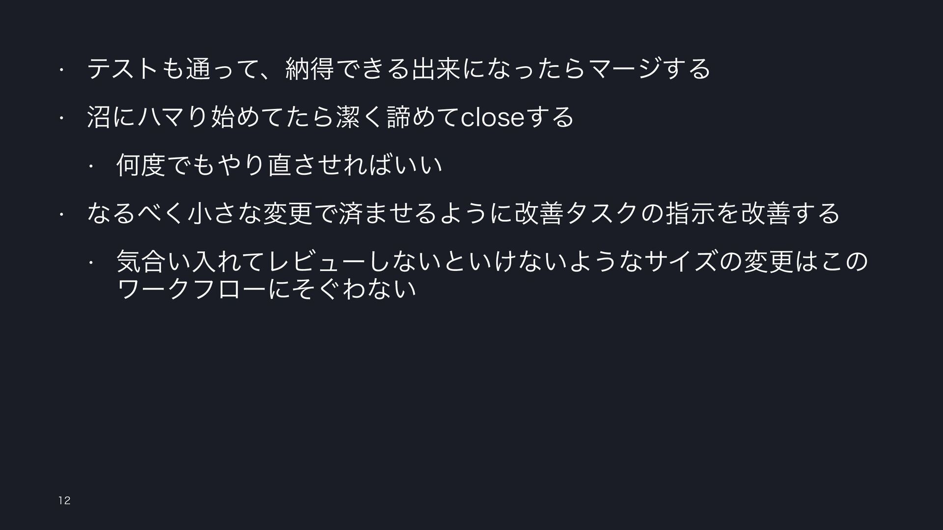 w ςετ௨ͬͯɺೲಘͰ͖Δग़དྷʹͳͬͨΒϚʔδ͢Δ w পʹϋϚΓ࢝ΊͯͨΒܿ͘ఘΊͯDMPTF͢Δ w ԿͰΓͤ͞Ε͍͍ w ͳΔ͘খ͞ͳมߋͰࡁ·ͤΔΑ͏ʹվળλεΫͷࢦࣔΛվળ͢Δ w ؾ߹͍ೖΕͯϨϏϡʔ͠ͳ͍ͱ͍͚ͳ͍Α͏ͳαΠζͷมߋ͜ͷ
