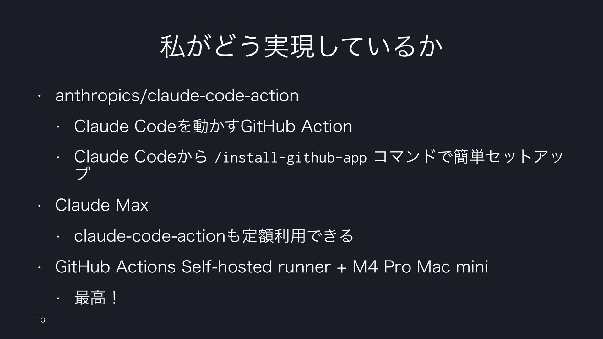 ࢲ͕Ͳ͏࣮ݱ͍ͯ͠Δ͔ w BOUISPQJDTDMBVEFDPEFBDUJPO w $MBVEF$PEFΛಈ͔͢(JU)VC"DUJPO w $MBVEF$PEF͔Β/install-github-appίϚϯυͰ؆୯ηοτΞο ϓ w $MBVEF.BY