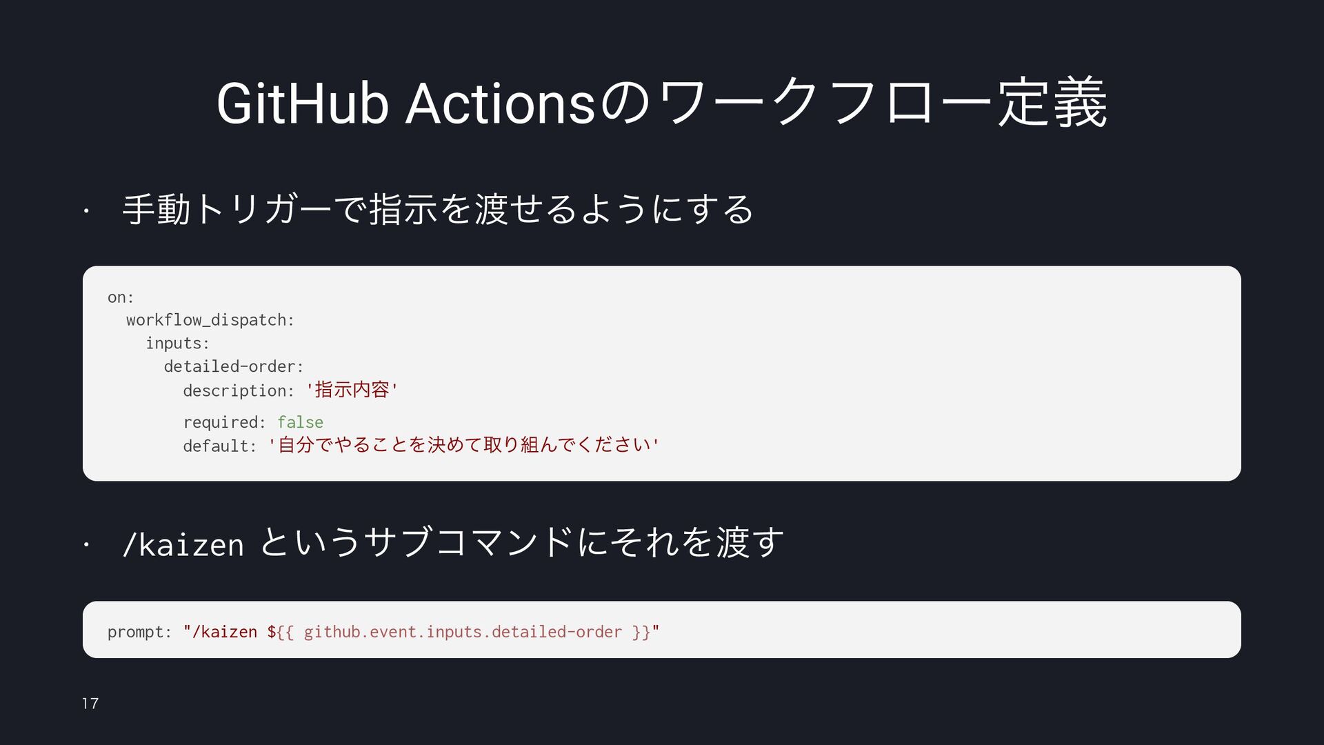 required: false default: 'ࣗͰΔ͜ͱΛܾΊͯऔΓΜͰ͍ͩ͘͞' w /kaizenͱ͍͏αϒίϚϯυʹͦΕΛ͢ prompt: "/kaizen ${{ github.event.inputs.detailed-order }}"