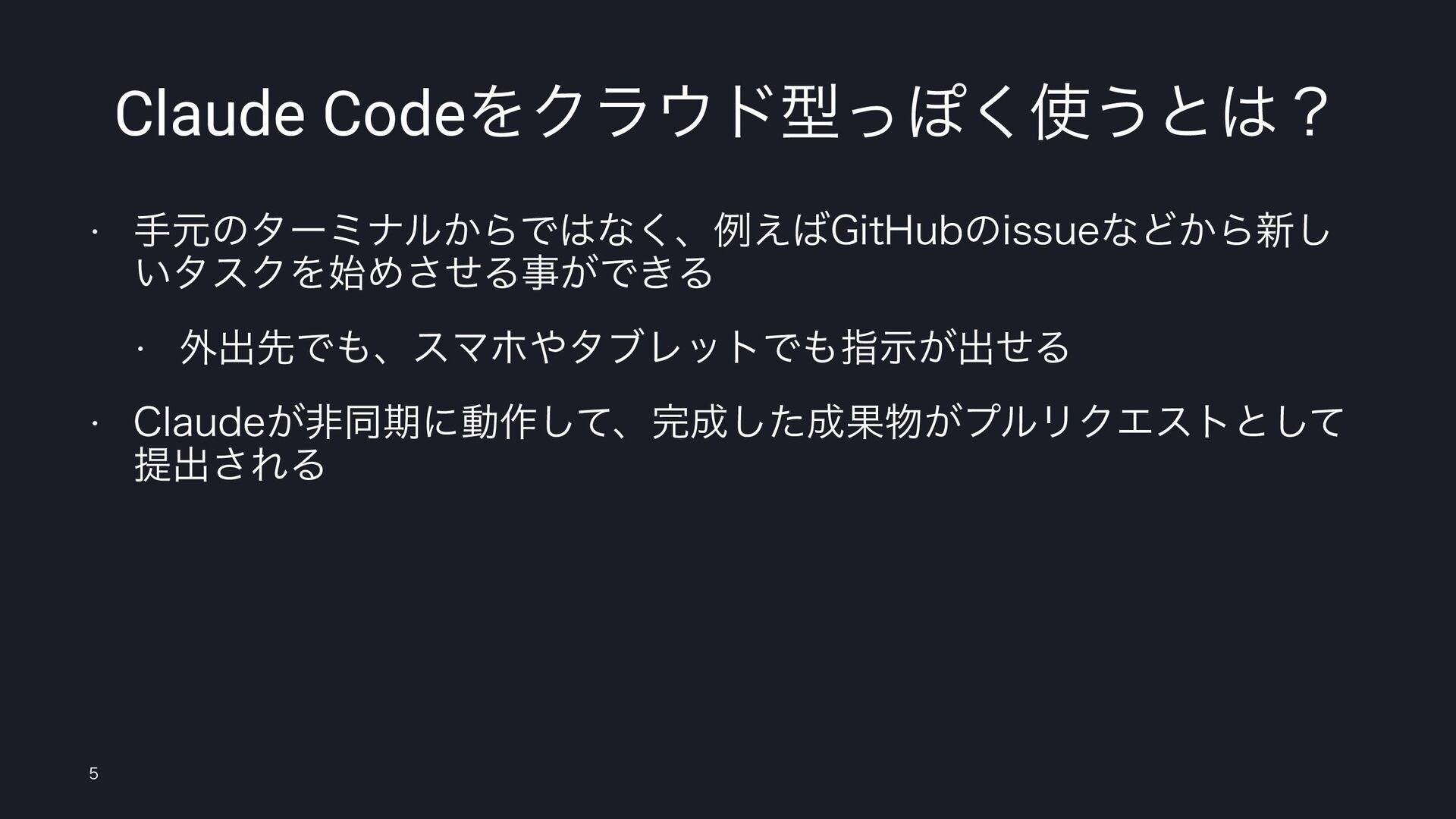 Claude CodeΛΫϥυܕͬΆ͘͏ͱʁ w खݩͷλʔϛφϧ͔ΒͰͳ͘ɺྫ͑(JU)VCͷJTTVFͳͲ͔Β৽͠ ͍λεΫΛ࢝Ίͤ͞Δࣄ͕Ͱ͖Δ w ֎ग़ઌͰɺεϚϗλϒϨοτͰࢦ͕ࣔग़ͤΔ w $MBVEF͕ඇಉظʹಈ࡞ͯ͠ɺͨ͠Ռ͕ϓϧϦΫΤετͱͯ͠ ఏग़͞ΕΔ