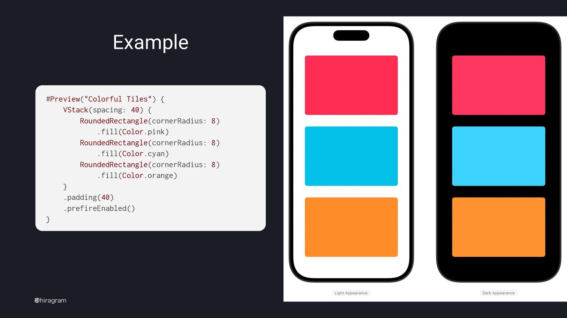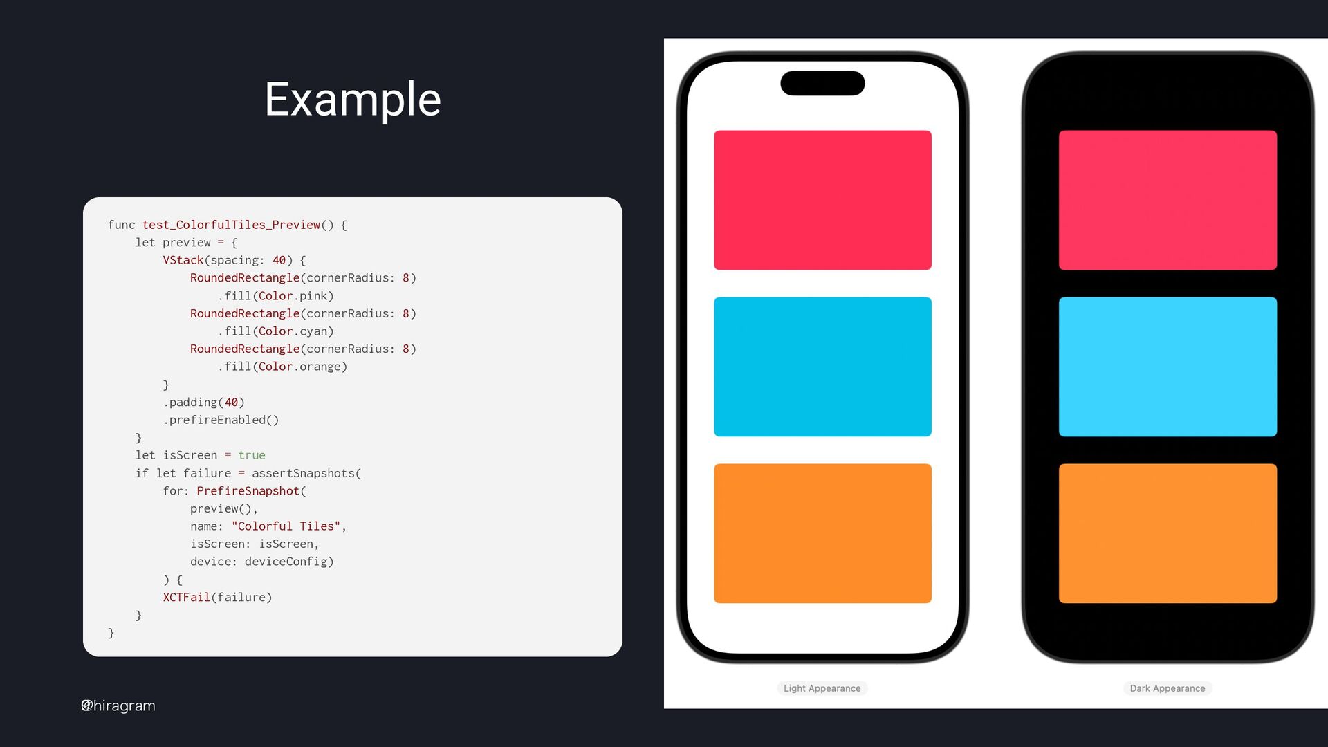2. Example func test_ColorfulTiles_Preview() { let preview = { VStack(spacing: 40)