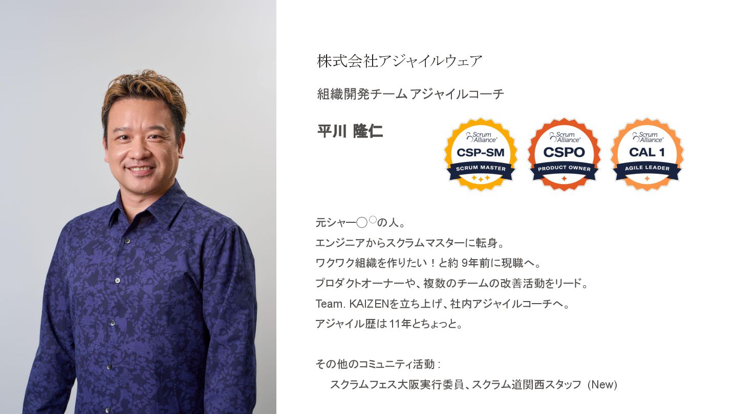 組織開発チーム アジャイルコーチ 株式会社アジャイルウェア 平川 隆仁 元シャー◯◯ 人。 エンジニアからスクラムマスターに転身。 ワクワク組織を作りたい!と約 9年前に現職へ。