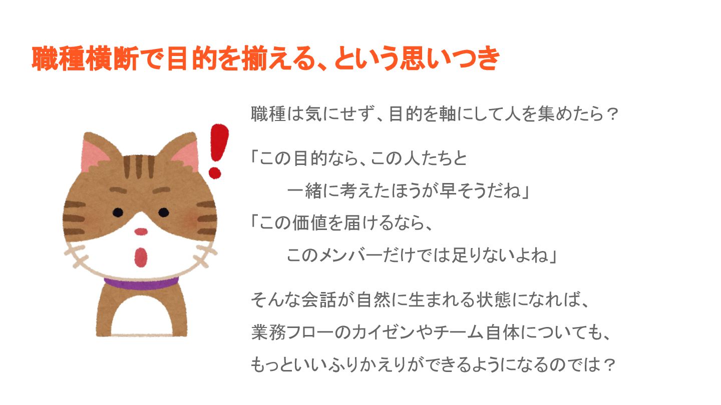 職種横断で目的を揃える、という思いつき 職種 気にせず、目的を軸にして人を集めたら? 「こ 目的なら、こ 人たちと 一緒に考えたほうが早そうだ 」 「こ 価値を届けるなら、