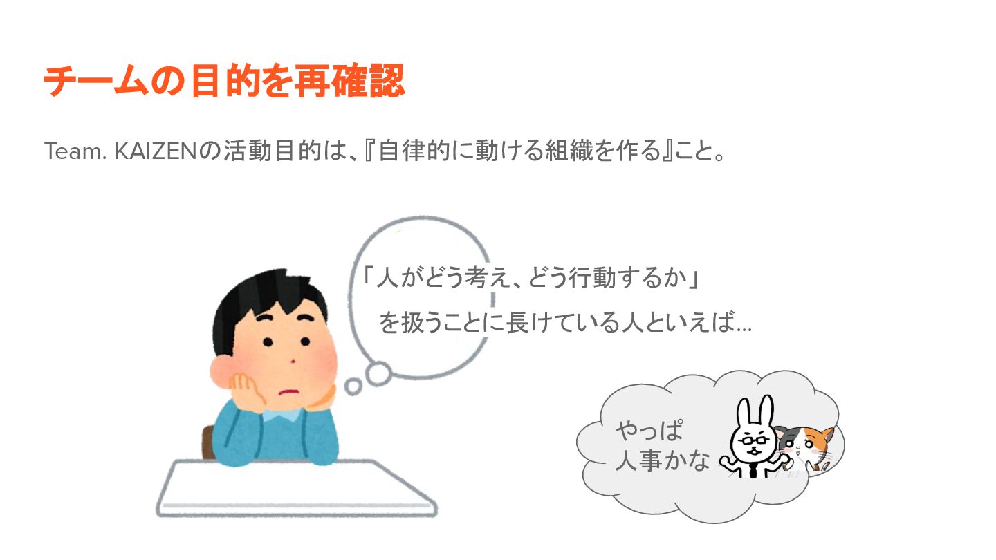 Team. KAIZEN 活動目的 、『自律的に動ける組織を作る』こと。 「人がどう考え、どう行動するか」 を扱うことに長けている人といえ ... チーム 目的を再確認 やっ