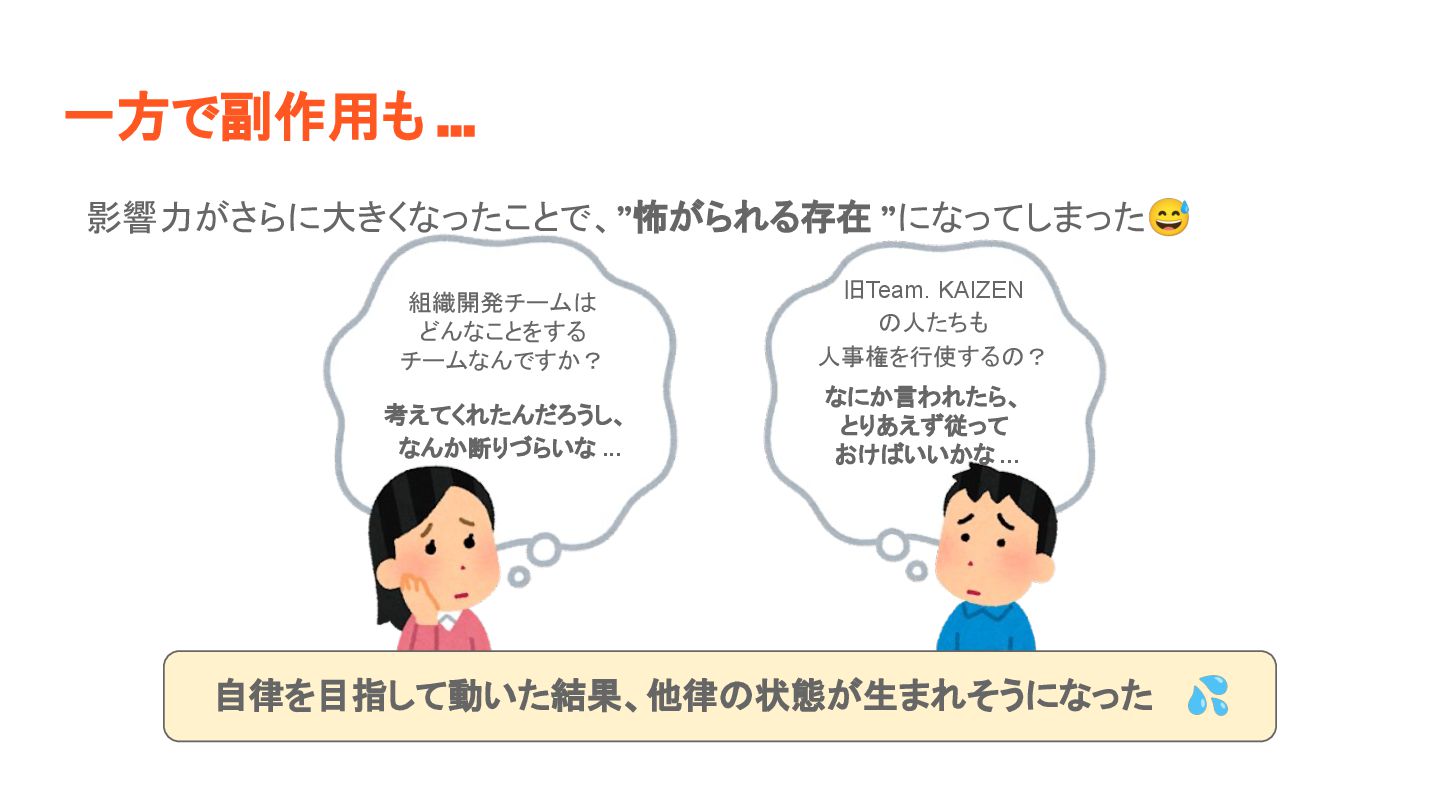 影響力がさらに大きくなったことで、”怖がられる存在 ”になってしまった😅 一方で副作用も ... 組織開発チーム どんなことをする チームなんですか? 旧Team. KAIZEN 人たちも