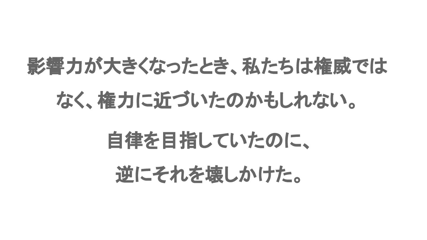 影響力が大きくなったとき、私たち 権威で なく、権力に近づいた かもしれない。 自律を目指していた に、 逆にそれを壊しかけた。