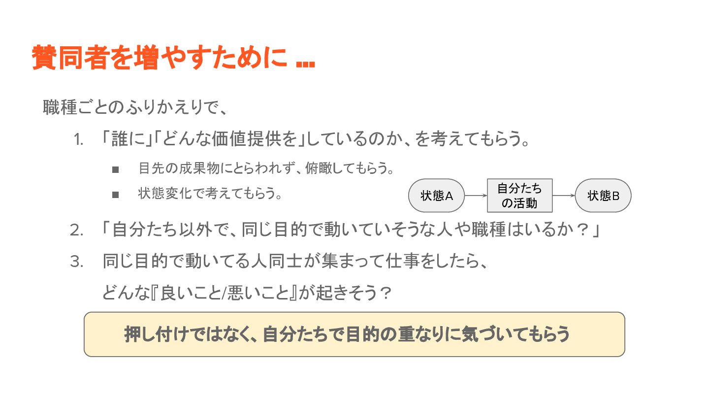 目的が揃うと、自然と動き始める(仮説) • 職種よりも、構 よりも、目的が大事。 • 目的が揃った瞬間、人 役割を超えて協働を始める。(=チーム?) 変革 、納得と関係性によって進む •