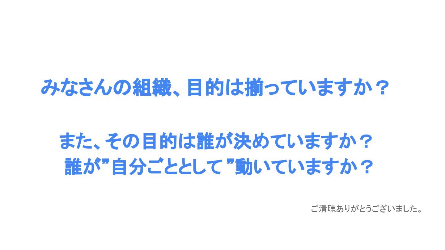 みなさん 組織、目的 揃っていますか? また、そ 目的 誰が決めていますか? 誰が”自分ごととして ”動いていますか? ご清聴ありがとうございました。