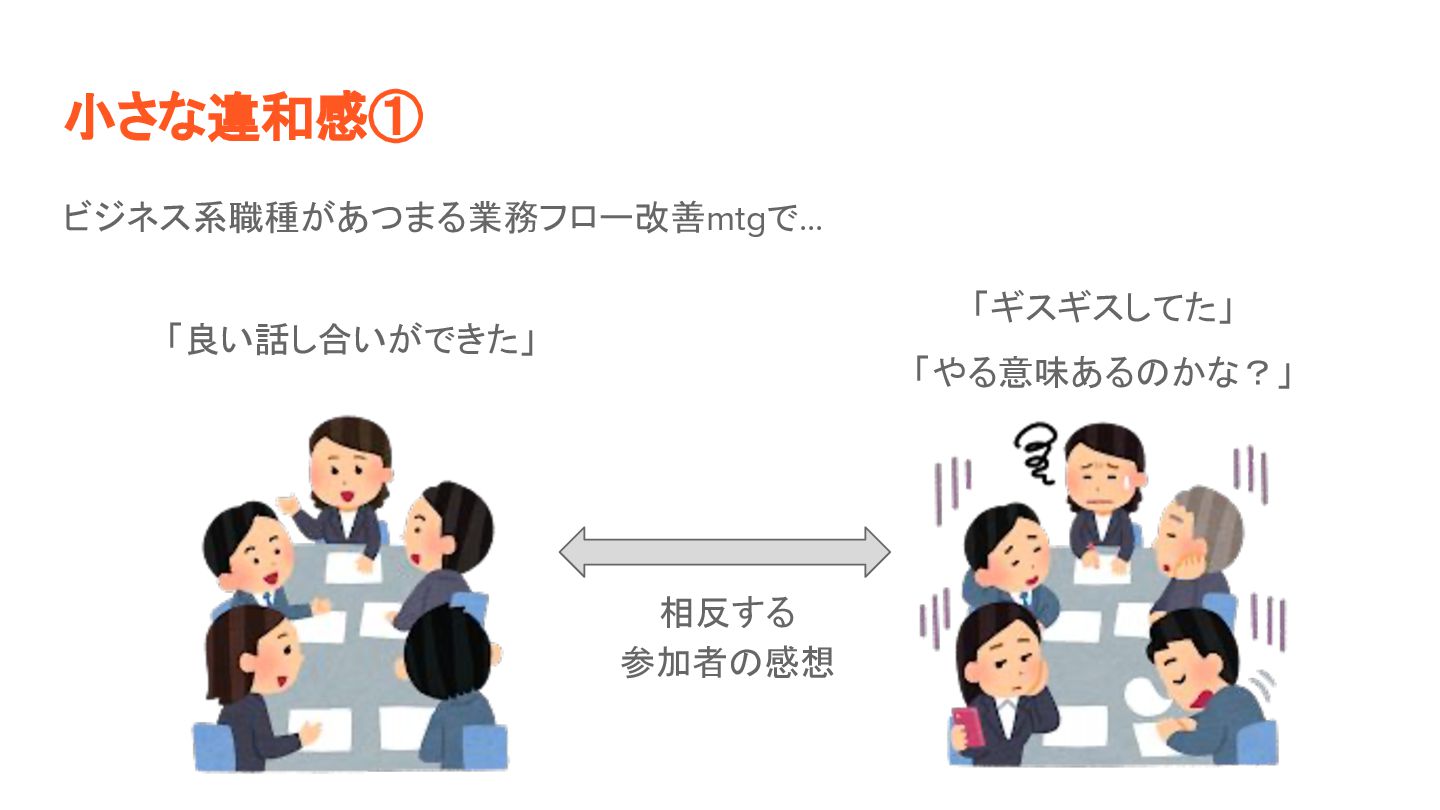小さな違和感① ビジネス系職種があつまる業務フロー改善mtgで... 「良い話し合いができた」 「ギスギスしてた」 「やる意味ある かな?」 相反する 参加者 感想