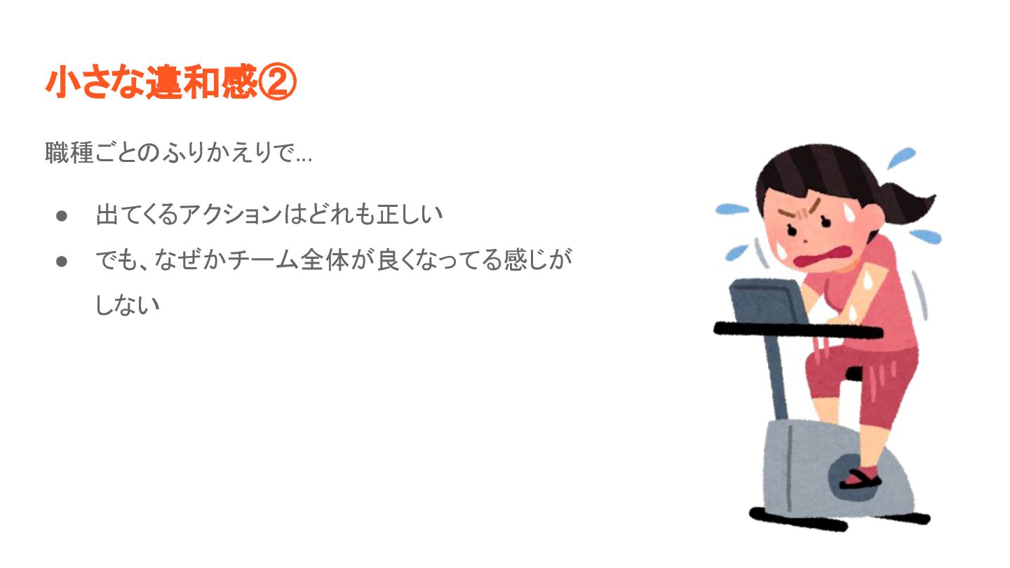 小さな違和感② 職種ごと ふりかえりで... • 出てくるアクション どれも正しい • でも、なぜかチーム全体が良くなってる感じが しない