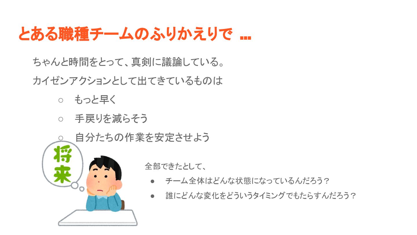 とある職種チーム ふりかえりで ... ちゃんと時間をとって、真剣に議論している。 カイゼンアクションとして出てきているも ◦ もっと早く ◦ 手戻りを減らそう ◦
