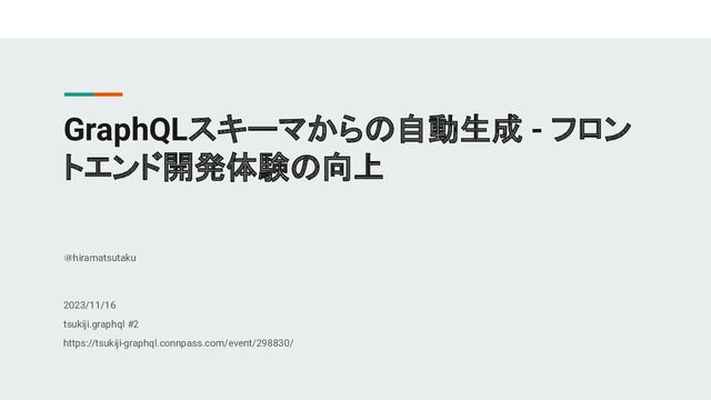 GraphQLスキーマからの自動生成 - フロン トエンド開発体験の向上 @hiramatsutaku 2023/11/16 tsukiji.graphql #2 https://tsukiji-graphql.connpass.com/event/298830/