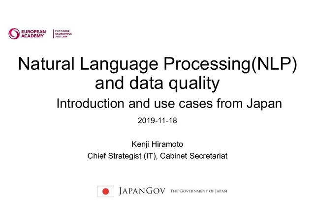 Characters Code Service Data Touris m Date, Address, Phon … Sensor Data Data item (Data definition) Information (Data model) Healthc are Transp ortatio n Disaste r Public service Infrastr ucture Manufa cture ・・・ Format Service catalogue AED Location Address LocationTwoDimensional GeographicCoordinate Equipment Information Spot of Equipment Business Hours Owner Access Availability User Day of Installation Homepage AED Information Type of Pad Expiry date Contact Type Model Number Serial Number Photo Note Information Source To use NLP effectively, it is easier to analyze if the data items are separated. We are promoting the government interoperability framework to all publicsectors.