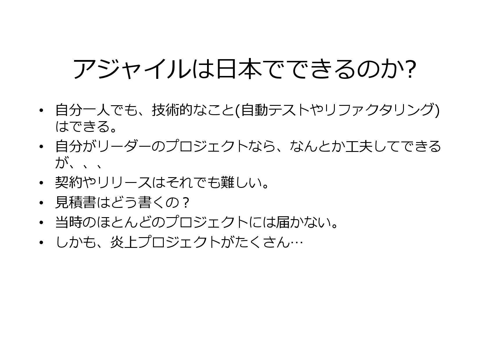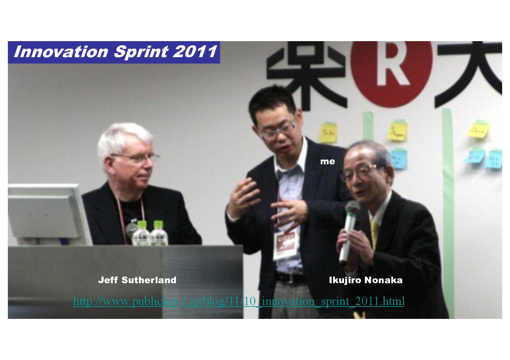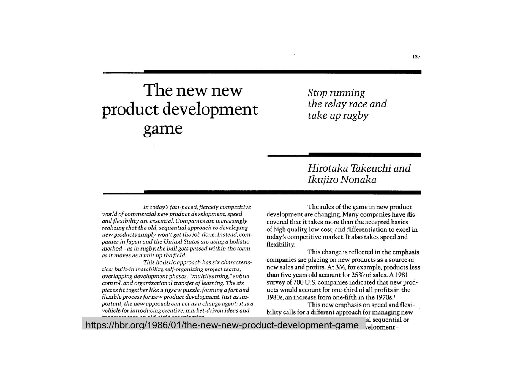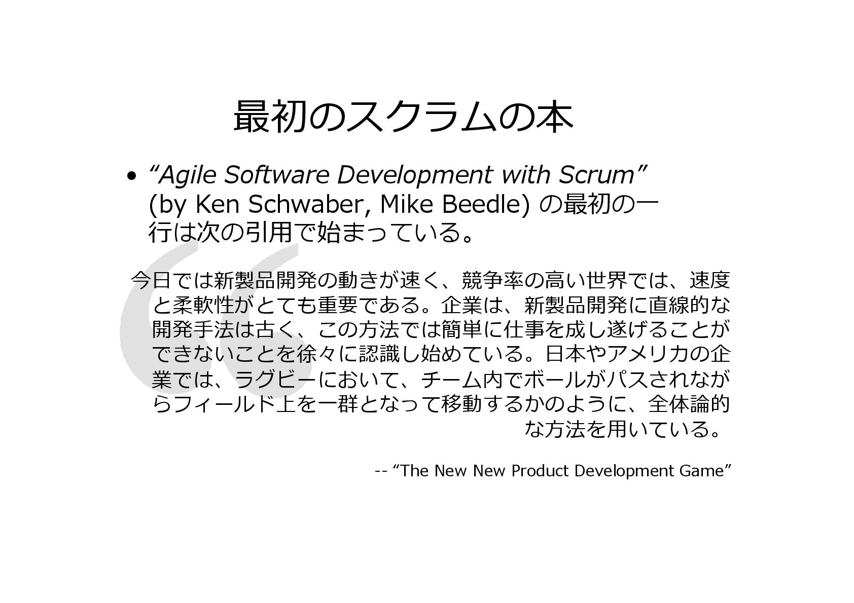 Mike Beedle) の最初の⼀ ⾏は次の引⽤で始まっている。 今⽇では新製品開発の動きが速く、競争率の⾼い世界では、速度 と柔軟性がとても重要である。企業は、新製品開発に直線的な 開発⼿法は古く、この⽅法では簡単に仕事を成し遂げることが できないことを徐々に認識し始めている。⽇本やアメリカの企 業では、ラグビーにおいて、チーム内でボールがパスされなが らフィールド上を⼀群となって移動するかのように、全体論的 な⽅法を⽤いている。 -- “The New New Product Development Game”