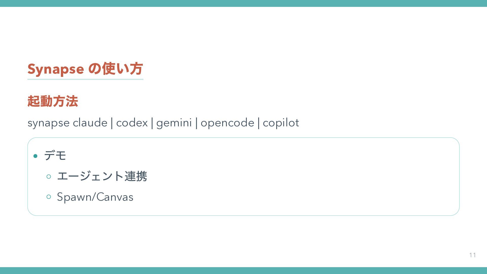 3. Synapse の使い方 起動方法 11 synapse claude | codex | gemini