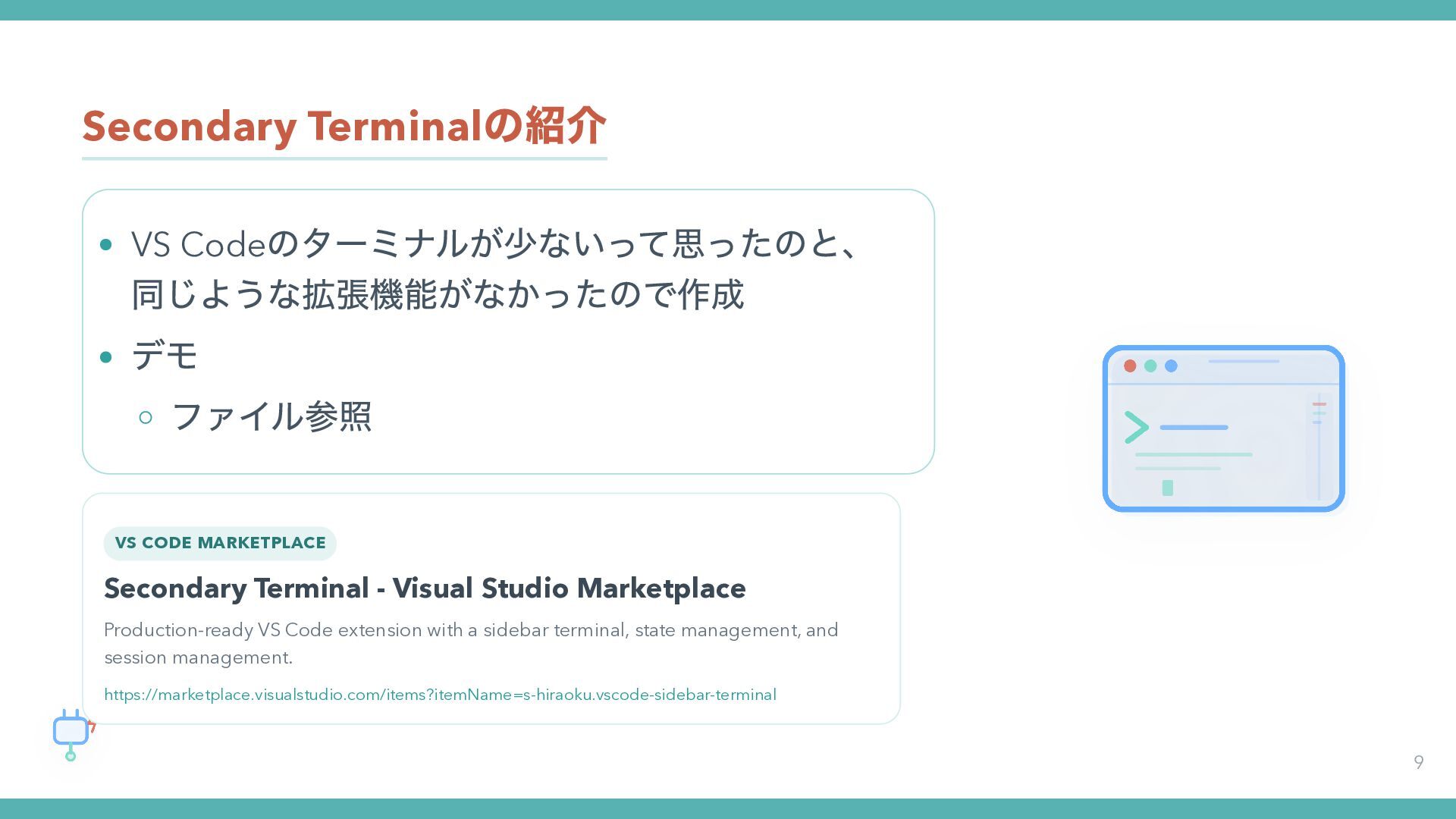 2. Secondary Terminal の紹介 9 VS Code のターミナルが少ないって思ったのと、 同じような拡張機能がなかったので作成 デモ ファイル参照