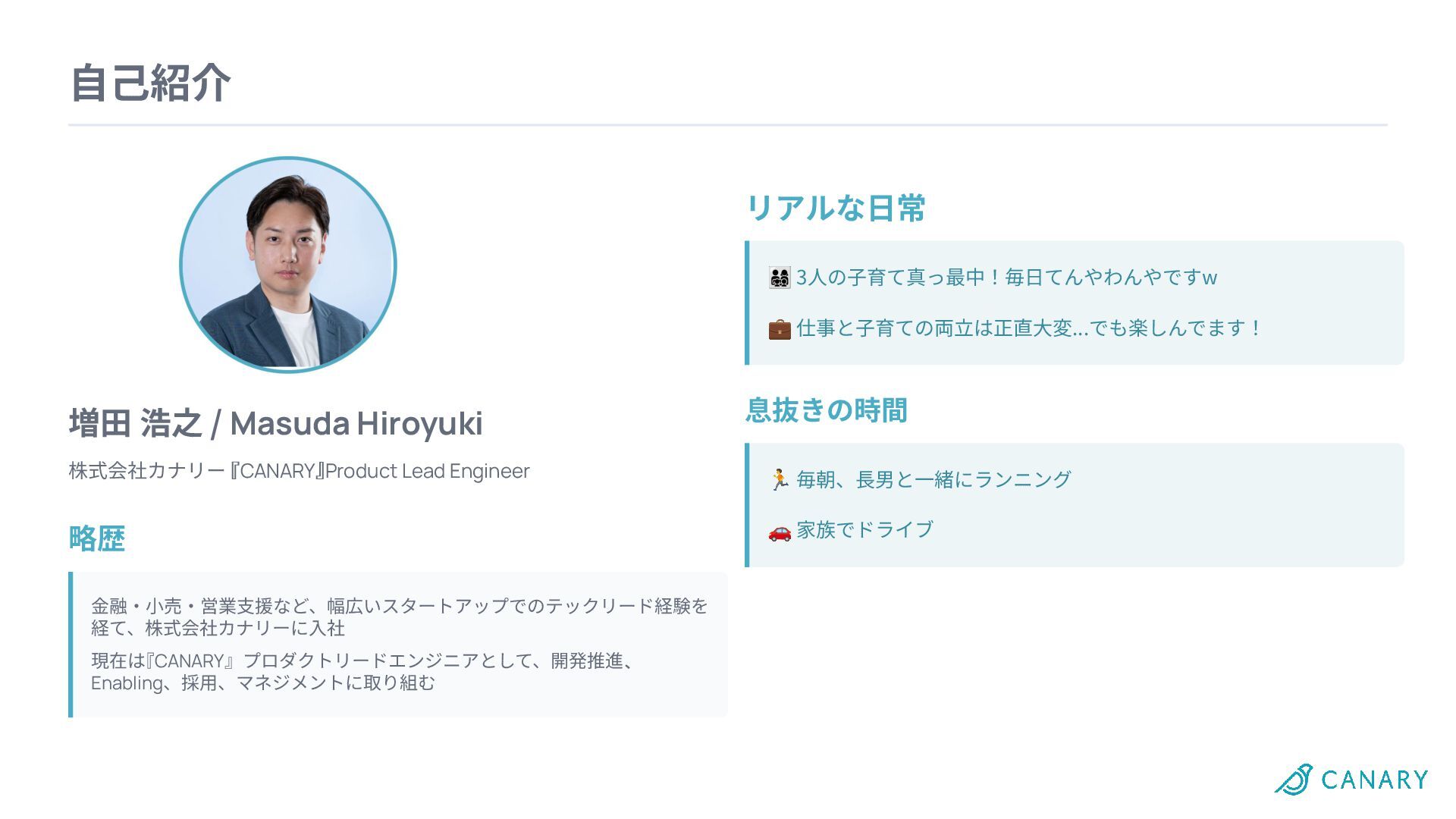 略歴 ⾦融‧⼩売‧営業⽀援など、幅広いスタートアップでのテックリード経験を 経て、株式会社カナリーに⼊社 現在は『CANARY』プロダクトリードエンジニアとして、開発推進、 Enabling、採⽤、マネジメントに取り組む リアルな⽇常 息抜きの時間 3⼈の⼦育て真っ最中!毎⽇てんやわんやですw 💼 仕事と⼦育ての両⽴は正直⼤変...でも楽しんでます! 🏃 毎朝、⻑男と⼀緒にランニング 🚗 家族でドライブ