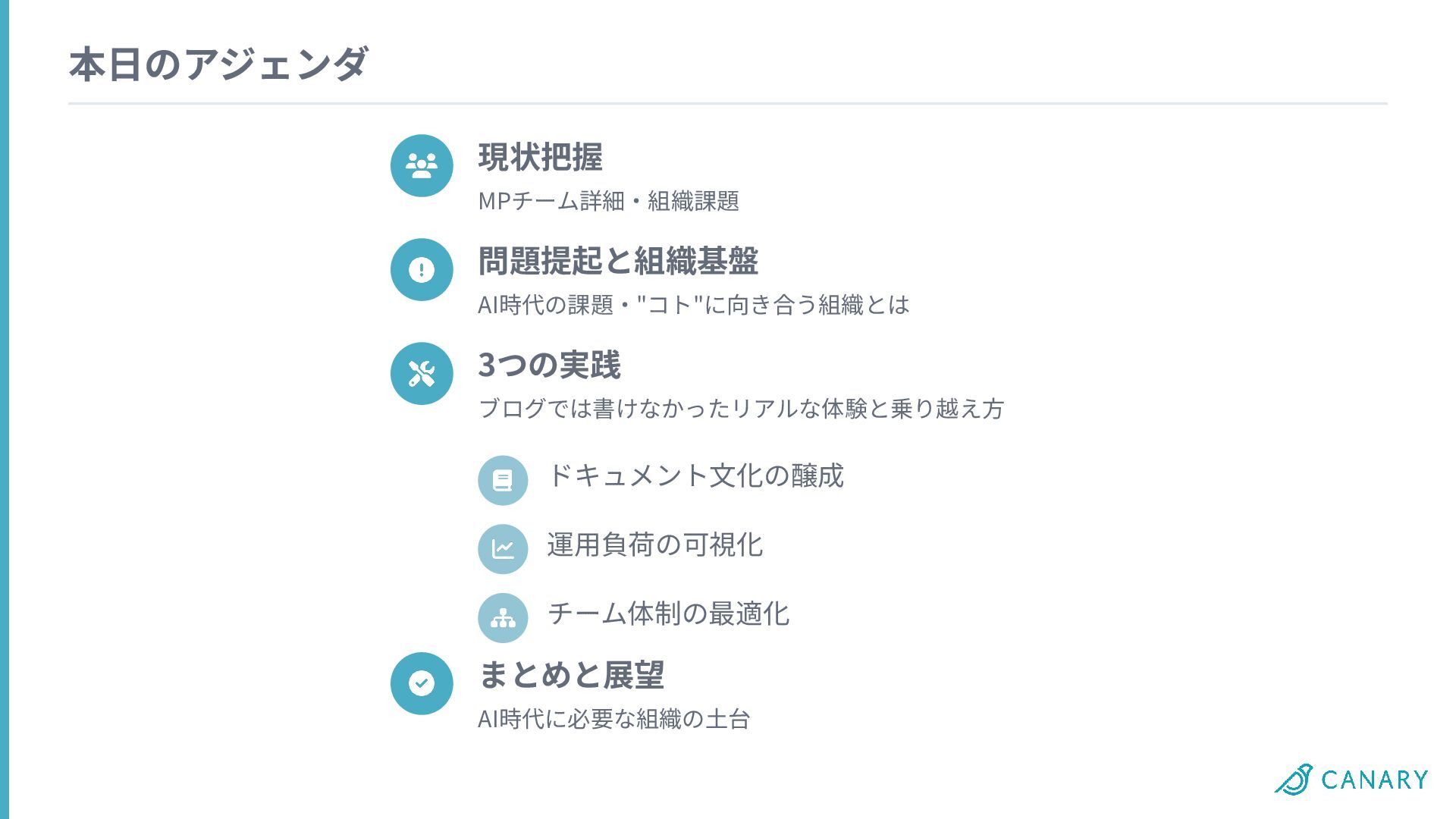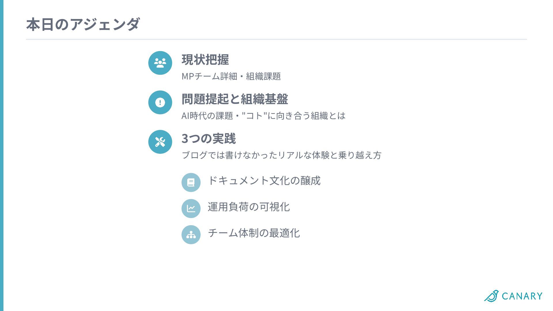 本⽇のアジェンダ まとめと展望 AI時代に必要な組織の⼟台 現状把握 MPチーム詳細‧組織課題 問題提起と組織基盤 AI時代の課題‧"コト"に向き合う組織とは 3つの実践 ブログでは書けなかったリアルな体験と乗り越え⽅ ドキュメント⽂化の醸成