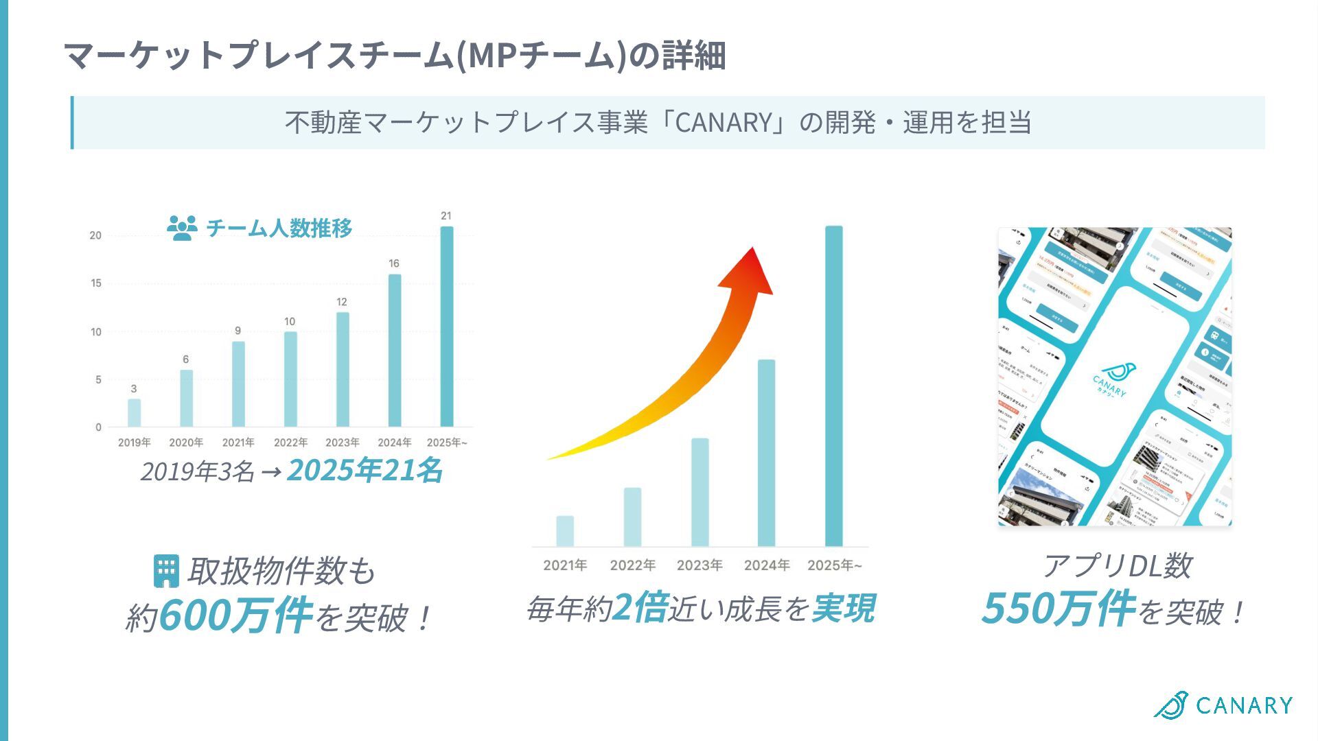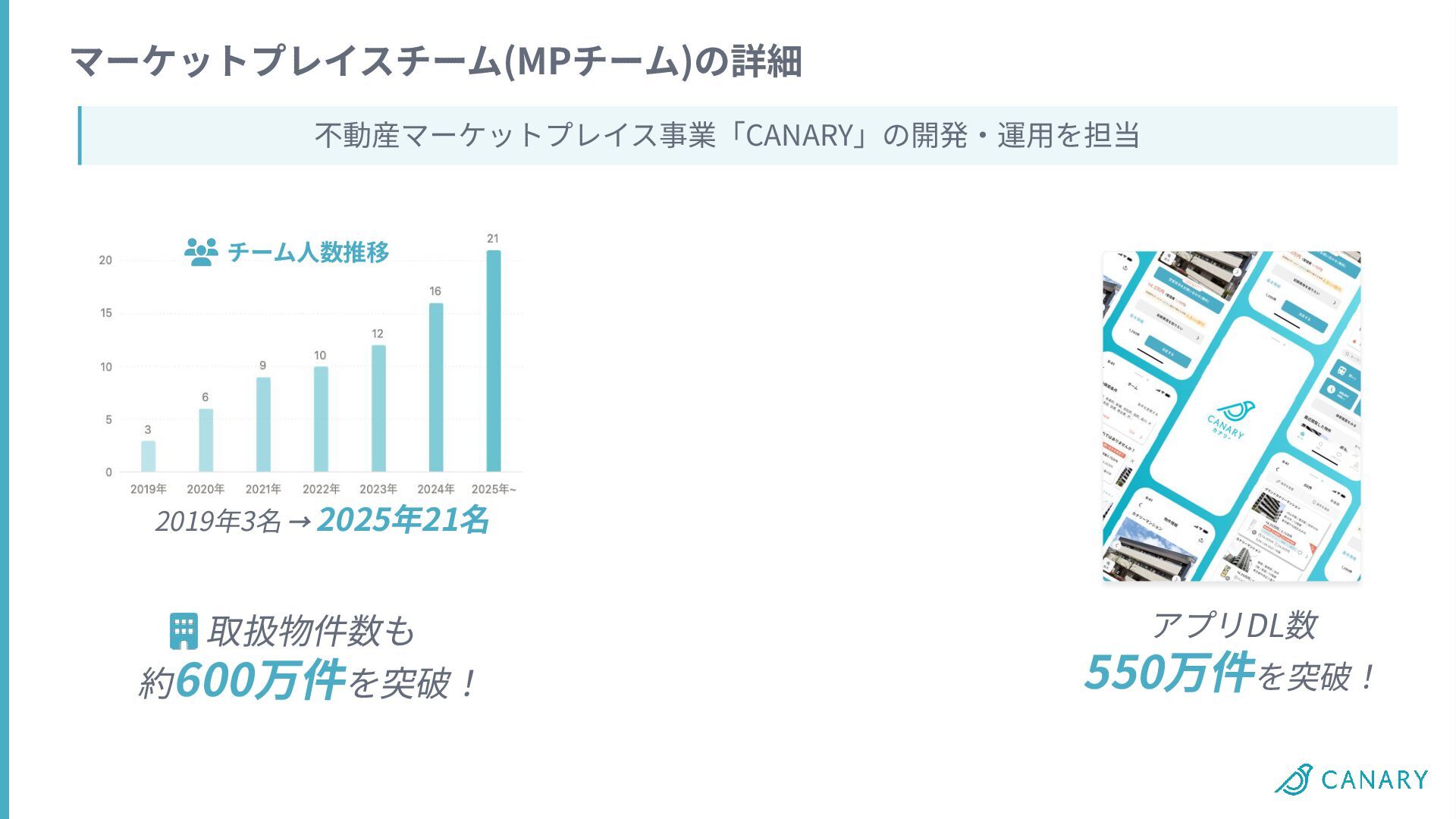 2019年3名 → 2025年21名 チーム⼈数推移 マーケットプレイスチーム(MPチーム)の詳細 不動産マーケットプレイス事業「CANARY」の開発‧運⽤を担当 毎年約2倍近い成⻑を実現 取扱物件数も 約600万件を突破! アプリDL数