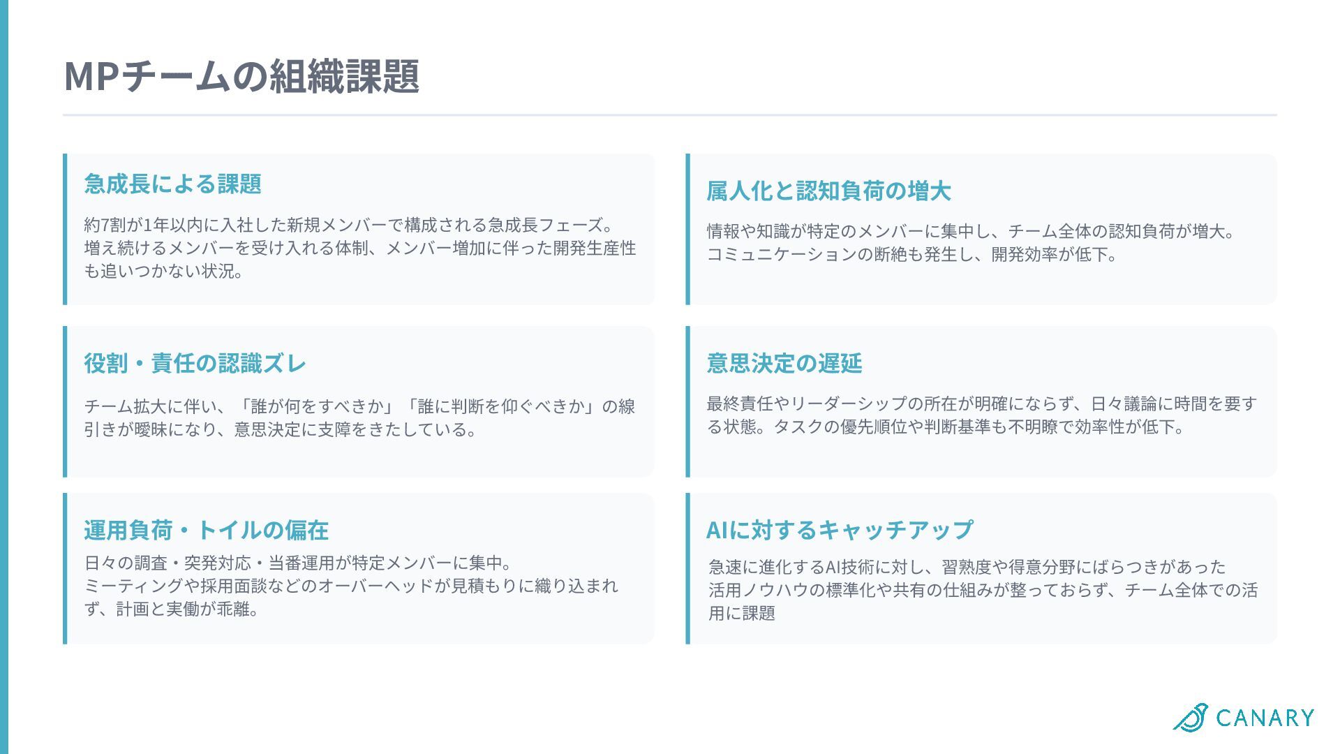 MPチームの組織課題 急成⻑による課題 約7割が1年以内に⼊社した新規メンバーで構成される急成⻑フェーズ。 増え続けるメンバーを受け⼊れる体制、メンバー増加に伴った開発⽣産性 も追いつかない状況。 役割‧責任の認識ズレ チーム拡⼤に伴い、「誰が何をすべきか」「誰に判断を仰ぐべきか」の線 引きが曖昧になり、意思決定に⽀障をきたしている。 運⽤負荷‧トイルの偏在 ⽇々の調査‧突発対応‧当番運⽤が特定メンバーに集中。
