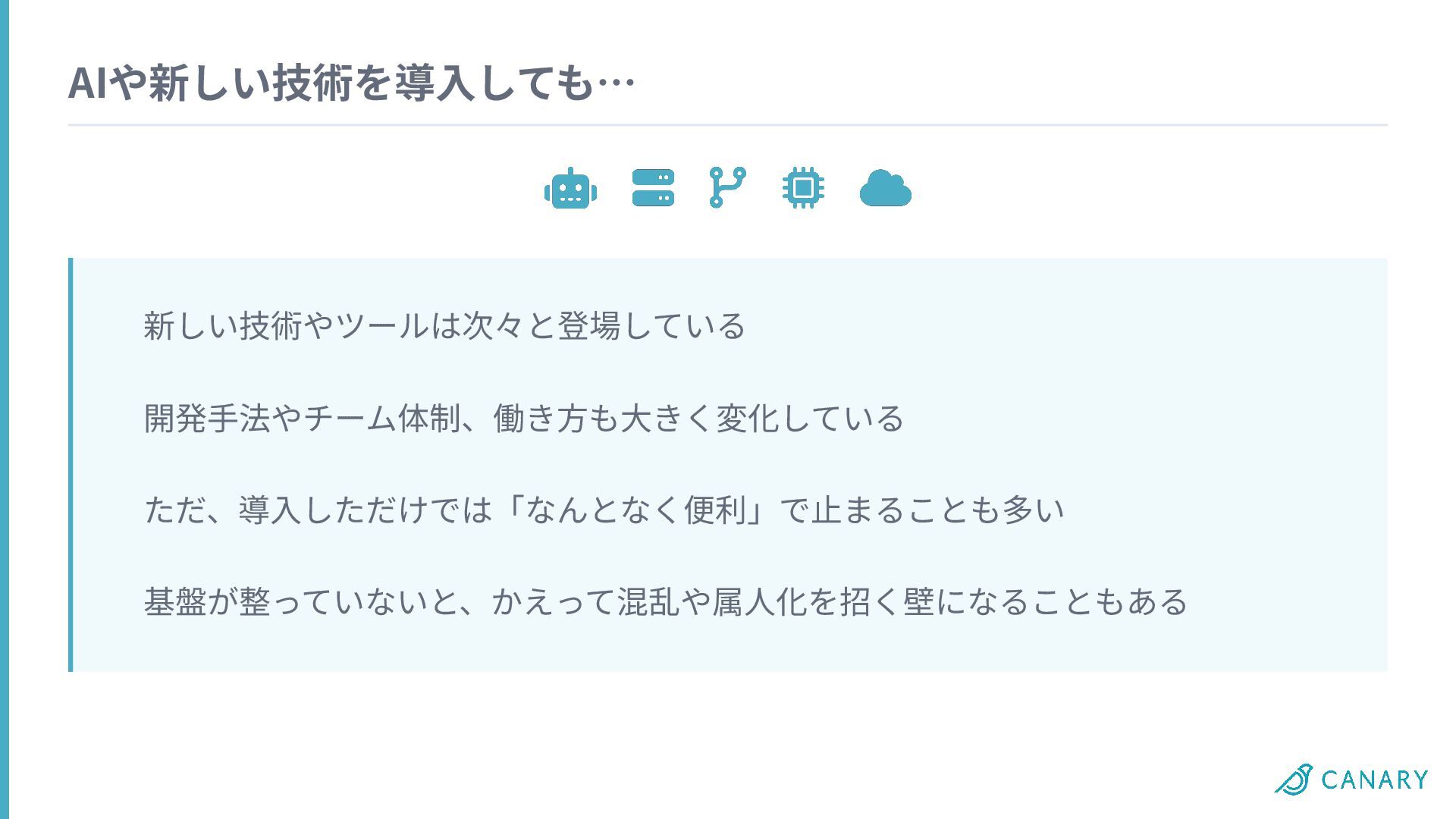 AIや新しい技術を導⼊しても… 新しい技術やツールは次々と登場している 開発⼿法やチーム体制、働き⽅も⼤きく変化している ただ、導⼊しただけでは「なんとなく便利」で⽌まることも多い 基盤が整っていないと、かえって混乱や属⼈化を招く壁になることもある