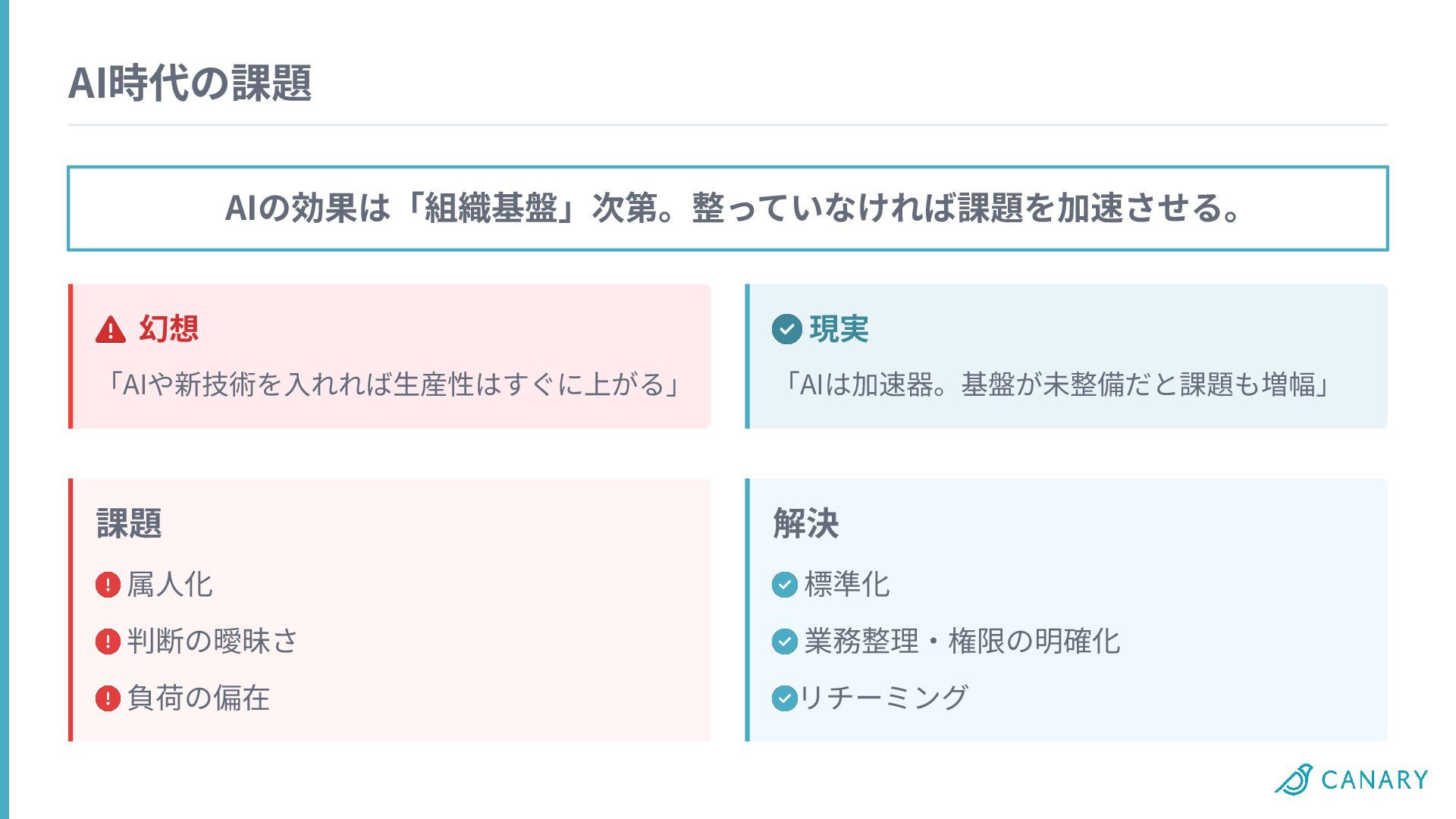 AI時代の課題 AIの効果は「組織基盤」次第。整っていなければ課題を加速させる。 幻想 「AIや新技術を⼊れれば⽣産性はすぐに上がる」 現実 「AIは加速器。基盤が未整備だと課題も増幅」 課題 属⼈化 判断の曖昧さ 負荷の偏在