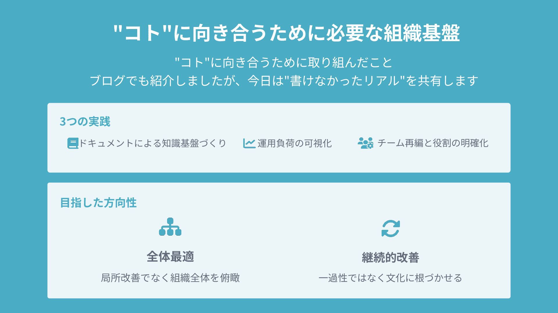 "コト"に向き合うために必要な組織基盤 "コト"に向き合うために取り組んだこと ブログでも紹介しましたが、今⽇は"書けなかったリアル"を共有します 3つの実践 ドキュメントによる知識基盤づくり 運⽤負荷の可視化 チーム再編と役割の明確化 ⽬指した⽅向性 全体最適 局所改善でなく組織全体を俯瞰