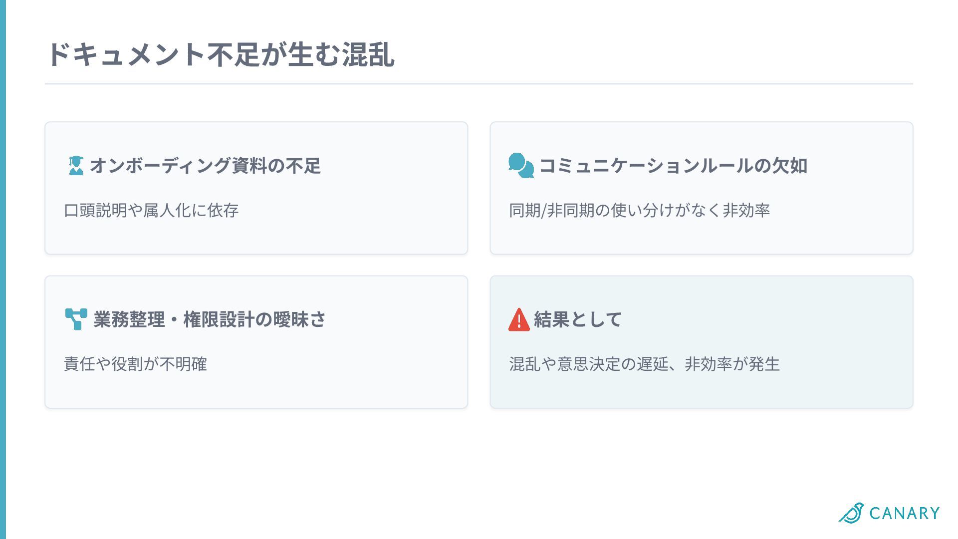 ドキュメント不⾜が⽣む混乱 オンボーディング資料の不⾜ ⼝頭説明や属⼈化に依存 業務整理‧権限設計の曖昧さ 責任や役割が不明確 コミュニケーションルールの⽋如 同期/⾮同期の使い分けがなく⾮効率 結果として 混乱や意思決定の遅延、⾮効率が発⽣