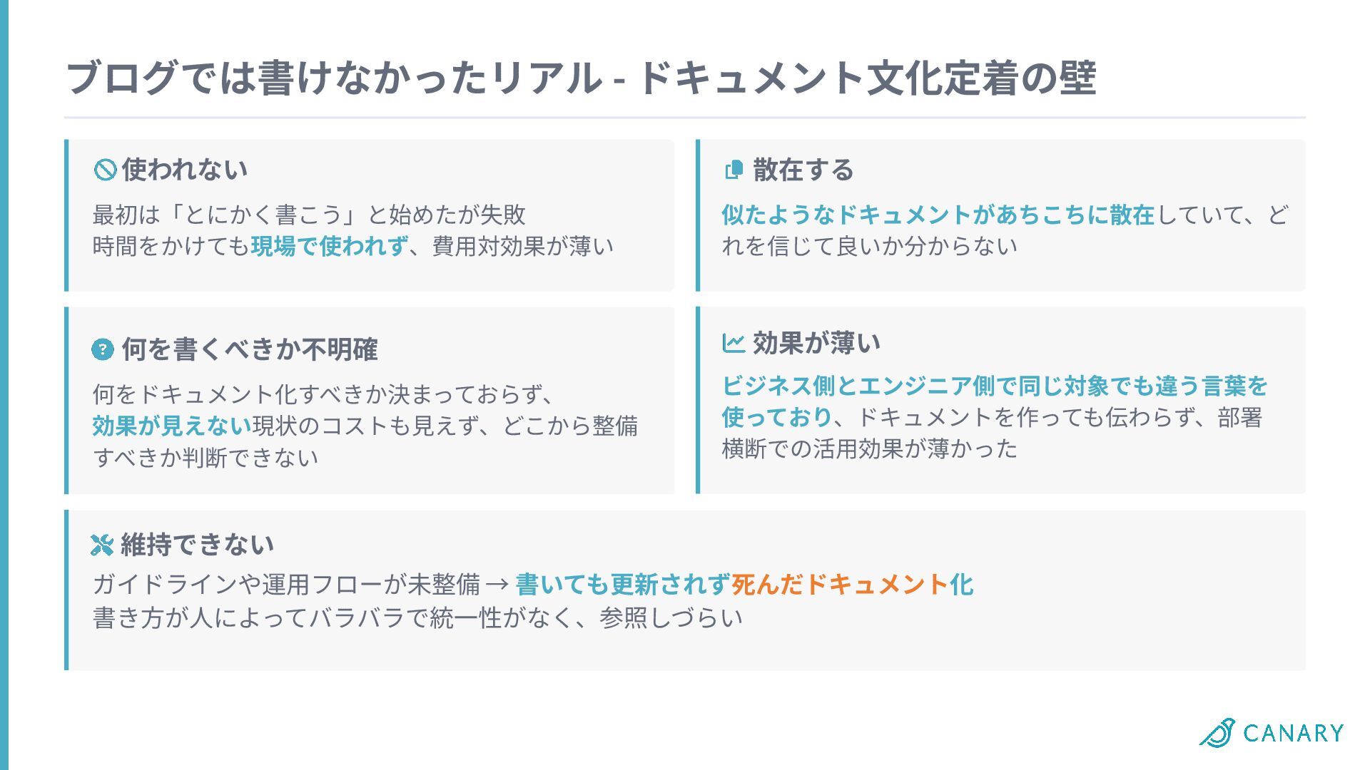 ブログでは書けなかったリアル - ドキュメント⽂化定着の壁 使われない 何を書くべきか不明確 維持できない 散在する 最初は「とにかく書こう」と始めたが失敗 時間をかけても現場で使われず、費⽤対効果が薄い ガイドラインや運⽤フローが未整備