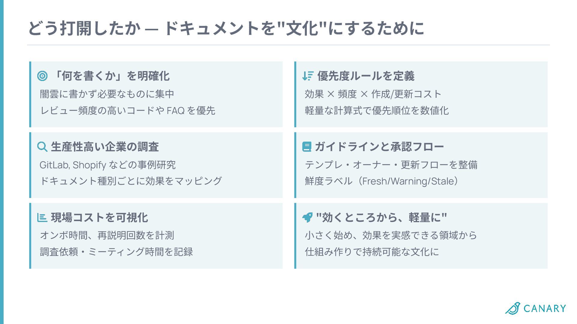 を優先 GitLab, Shopify などの事例研究 ドキュメント種別ごとに効果をマッピング 現場コストを可視化 オンボ時間、再説明回数を計測 調査依頼‧ミーティング時間を記録 効果 × 頻度 × 作成/更新コスト 軽量な計算式で優先順位を数値化 テンプレ‧オーナー‧更新フローを整備 鮮度ラベル(Fresh/Warning/Stale) "効くところから、軽量に" ⼩さく始め、効果を実感できる領域から 仕組み作りで持続可能な⽂化に