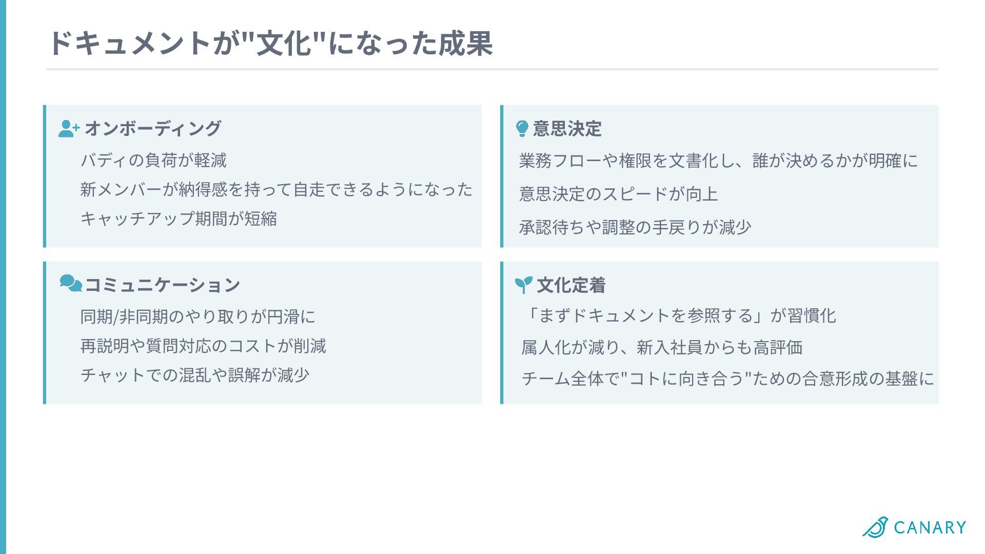 「まずドキュメントを参照する」が習慣化 属⼈化が減り、新⼊社員からも⾼評価 チーム全体で"コトに向き合う"ための合意形成の基盤に コミュニケーション 同期/⾮同期のやり取りが円滑に 再説明や質問対応のコストが削減 チャットでの混乱や誤解が減少