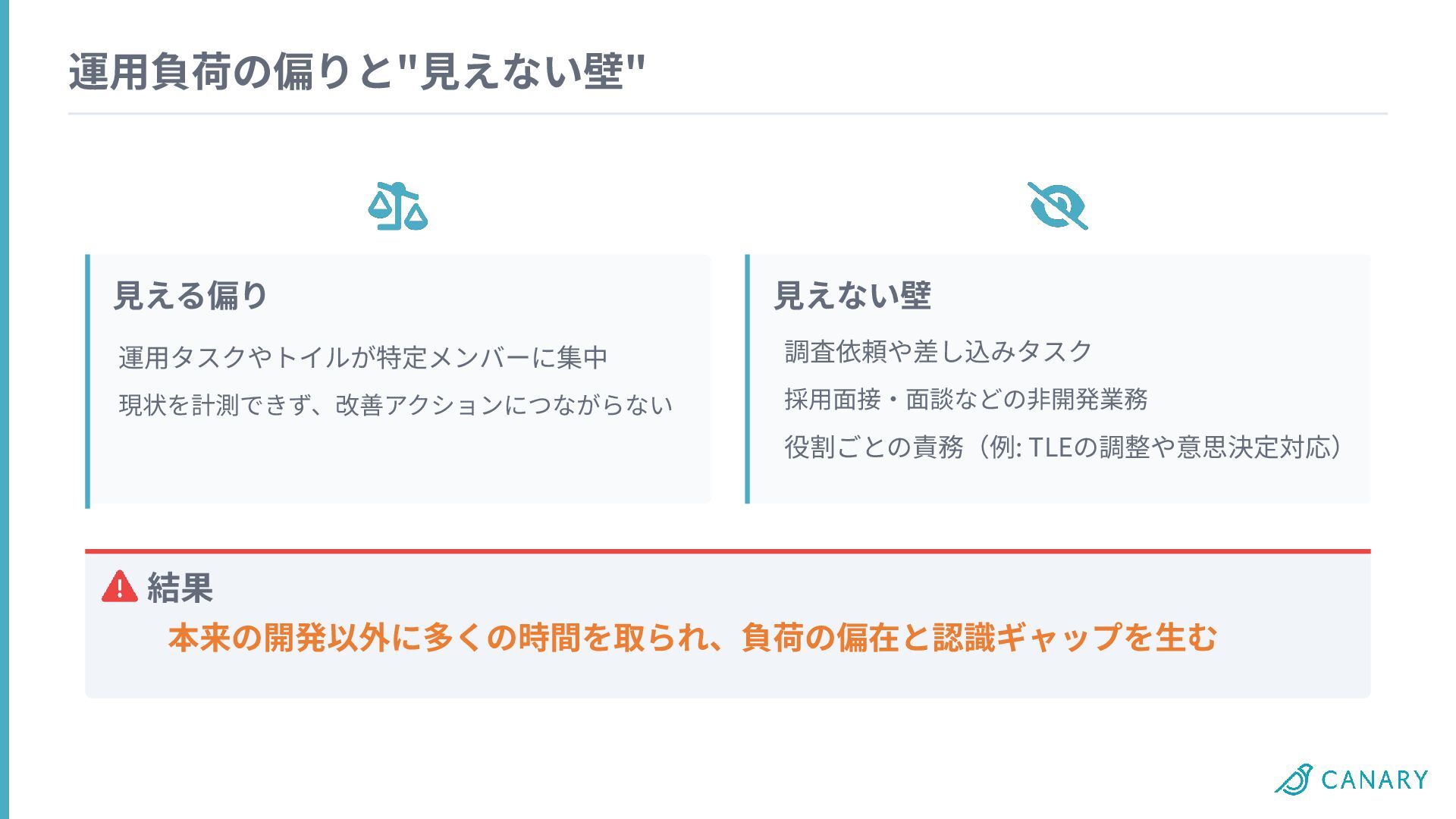 運⽤負荷の偏りと"⾒えない壁" ⾒える偏り 運⽤タスクやトイルが特定メンバーに集中 現状を計測できず、改善アクションにつながらない ⾒えない壁 調査依頼や差し込みタスク 採⽤⾯接‧⾯談などの⾮開発業務 役割ごとの責務(例: TLEの調整や意思決定対応) 結果
