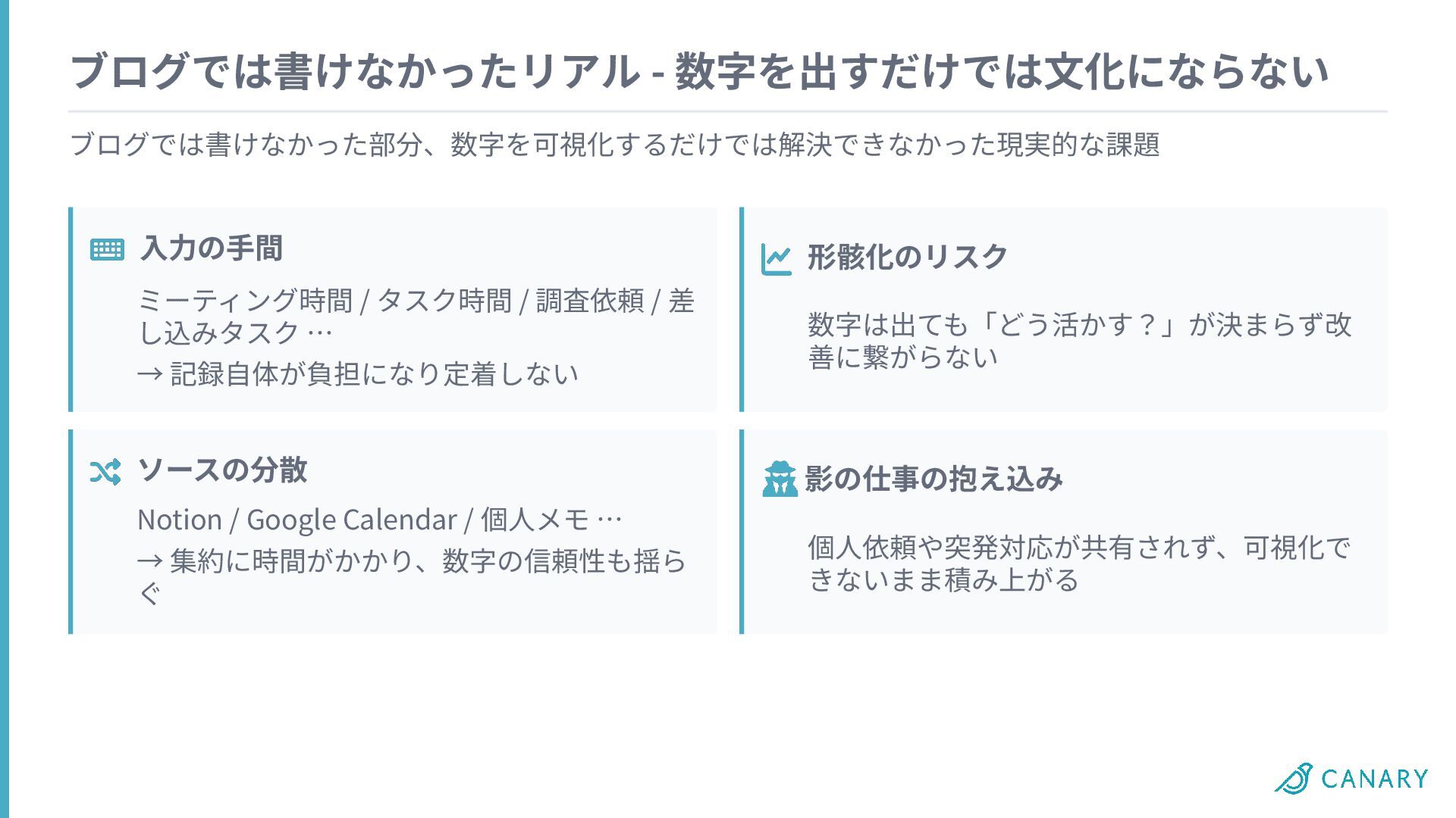 調査依頼 / 差 し込みタスク … → 記録⾃体が負担になり定着しない 影の仕事の抱え込み Notion / Google Calendar / 個⼈メモ … → 集約に時間がかかり、数字の信頼性も揺ら ぐ 形骸化のリスク 数字は出ても「どう活かす?」が決まらず改 善に繋がらない 個⼈依頼や突発対応が共有されず、可視化で きないまま積み上がる