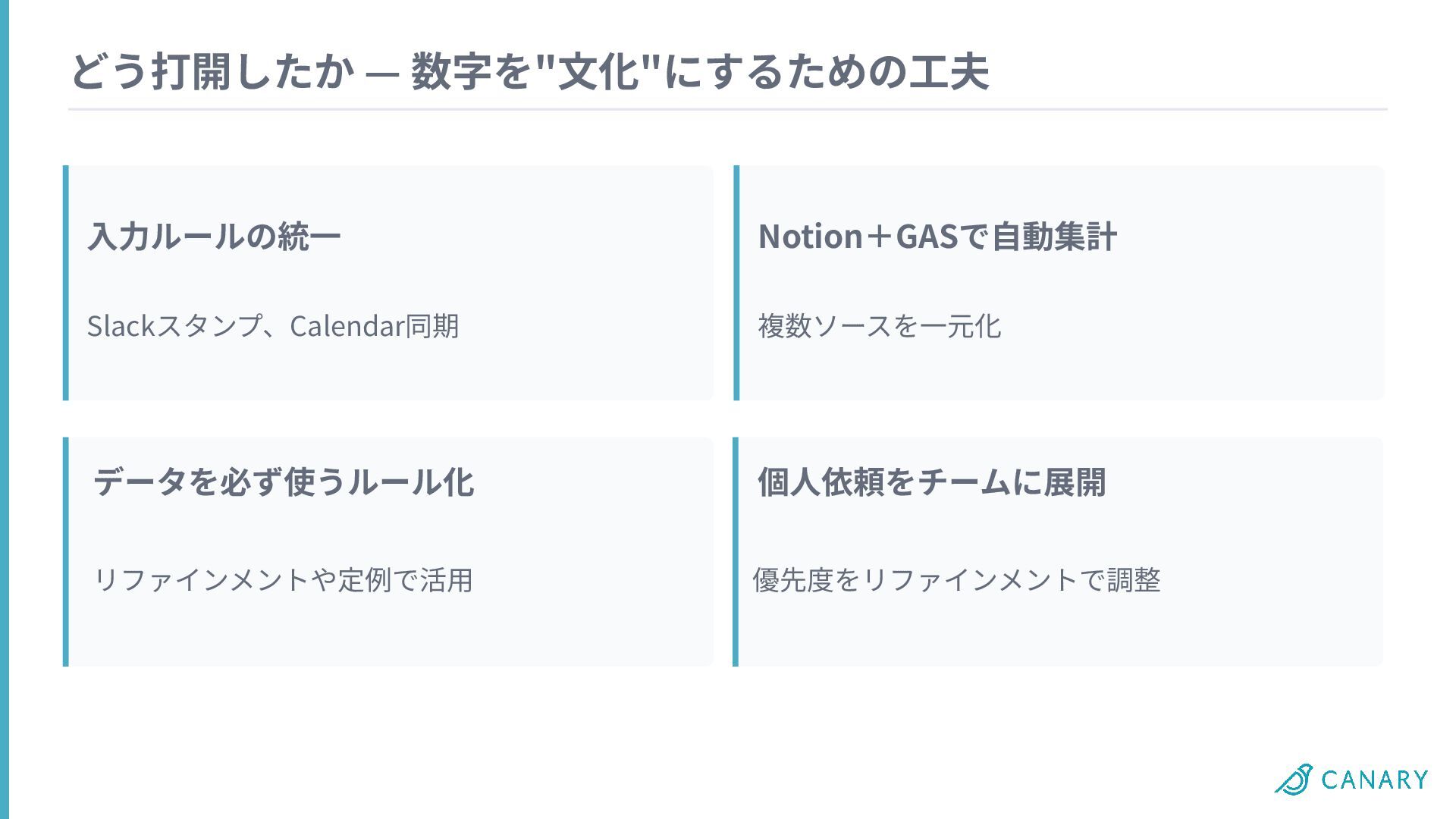どう打開したか — 数字を"⽂化"にするための⼯夫 ⼊⼒ルールの統⼀ Notion+GASで⾃動集計 データを必ず使うルール化 個⼈依頼をチームに展開 Slackスタンプ、Calendar同期 複数ソースを⼀元化 リファインメントや定例で活⽤