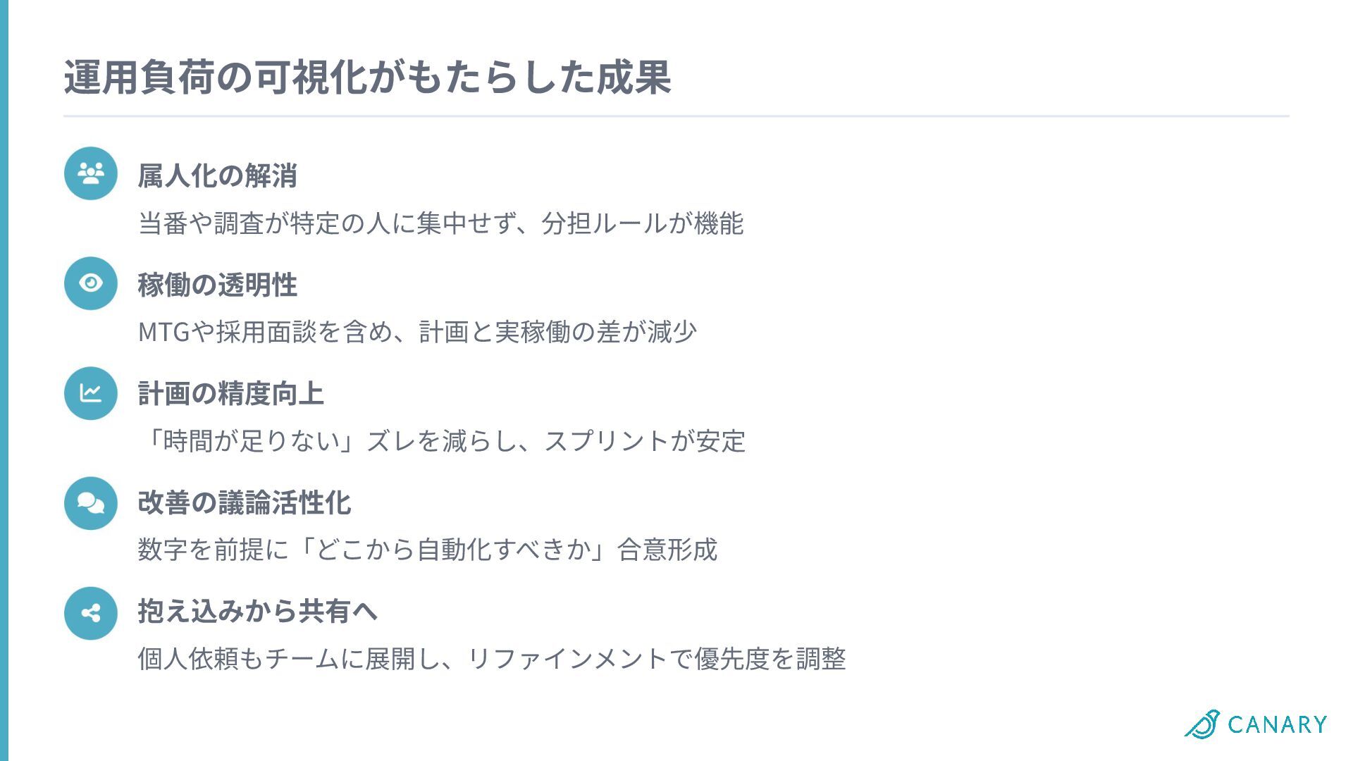 運⽤負荷の可視化がもたらした成果 属⼈化の解消 稼働の透明性 当番や調査が特定の⼈に集中せず、分担ルールが機能 MTGや採⽤⾯談を含め、計画と実稼働の差が減少 計画の精度向上 改善の議論活性化 「時間が⾜りない」ズレを減らし、スプリントが安定 抱え込みから共有へ 数字を前提に「どこから⾃動化すべきか」合意形成